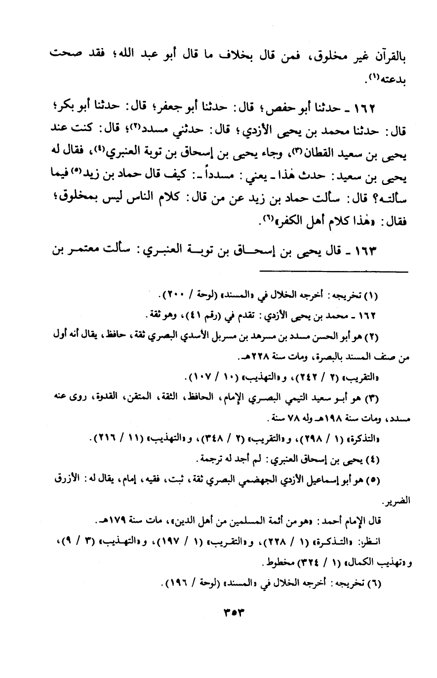 162 - حَدَّثَنَا أَبُو حَفْصٍ، قَالَ: حَدَّثَنَا أَبُو جَعْفَرٍ، قَالَ: حَدَّثَنَا أَبُو بَكْرٍ، قَالَ: حَدَّثَنَا مُحَمَّدُ بْنُ يَحْيَى الْأَزْدِيُّ، قَالَ: حَدَّثَنِي مُسَدَّدٌ، قَالَ: كُنْتُ عِنْدَ يَحْيَى بْنِ سَعِيدٍ الْقَطَّانِ، وَجَاءَ يَحْيَى بْنُ إِسْحَاقَ بْنِ تَوْبَةَ الْعَنْبَرِيُّ، فَقَالَ لَهُ يَحْيَى بْنُ سَعِيدٍ: حَدِّثْ هَذَا، يَعْنِي مُسَدَّدًا كَيْفَ قَالَ حَمَّادُ بْنُ زَيْدٍ فِيمَا سَأَلْتَهُ؟ قَالَ: سَأَلْتُ حَمَّادَ بْنَ زَيْدٍ عَنْ مَنْ قَالَ: كَلَامُ النَّاسِ لَيْسَ بِمَخْلُوقٍ، فقَالَ: §هَذَا كَلَامُ أَهْلِ الْكُفْرِ "
