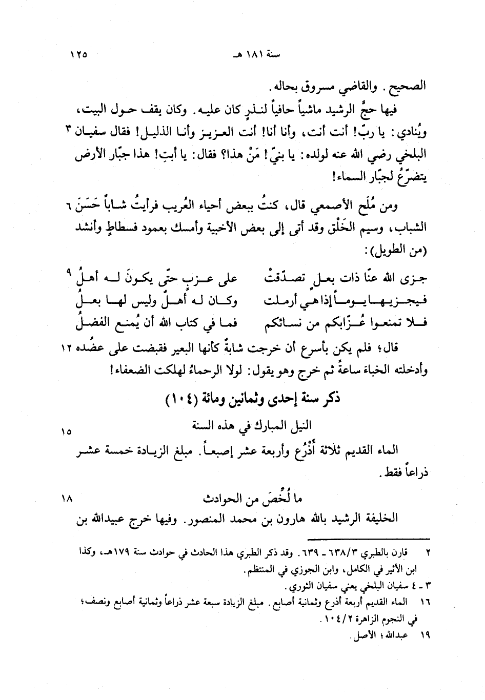 فيها حجّ الرشيد ماشيا حافيا لنذر كان عليه. وكان يقف حول البيت، وينادي: يا ربّ! أنت أنت، وأنا أنا! أنت العزيز وأنا الذليل! فقال سفيان البلخي رضي الله عنه لولده: يا بنيّ! من هذا؟ فقال: يا أبت! هذا جبّار الأرض يتضرّع لجبّار السماء!