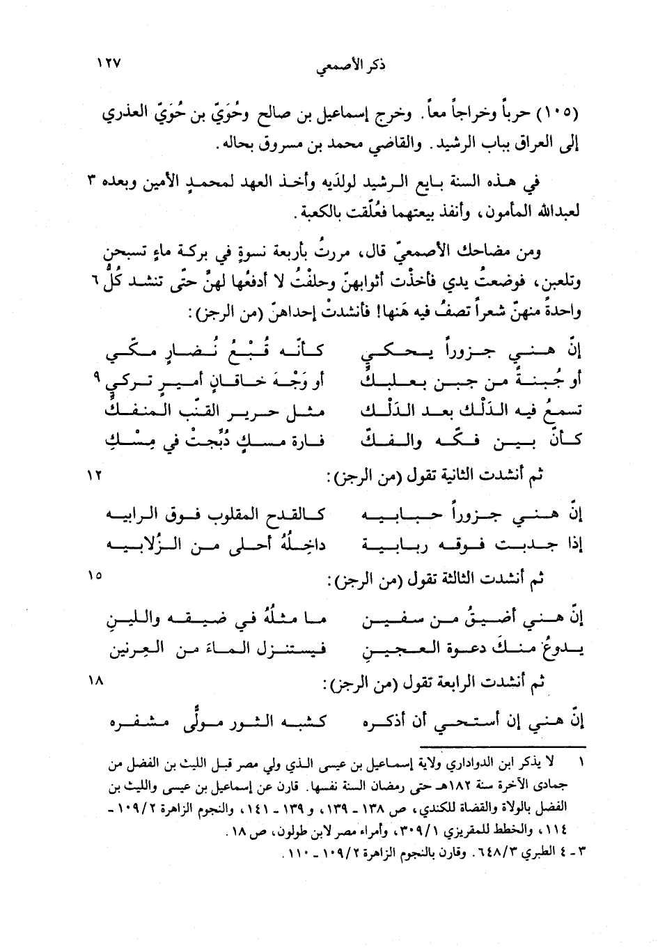 ومن مضاحك الأصمعيّ قال، مررت بأربعة نسوة في بركة ماء تسبحن وتلعبن، فوضعت يدي فأخذت أثوابهنّ وحلفت لا أدفعها لهنّ حتّى تنشد كلّ واحدة منهنّ شعرا تصف فيه هنها! فأنشدت إحداهنّ (من الرجز):