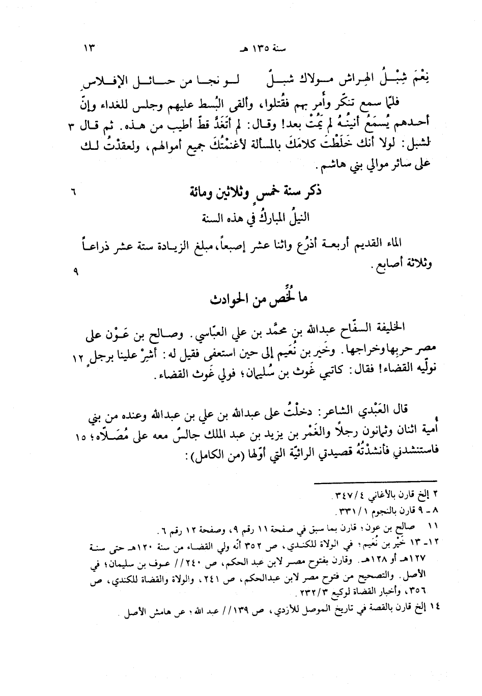 الخليفة السفّاح عبد الله بن محمّد بن علي العبّاسي. وصالح بن عون على مصر حربها وخراجها. وخير بن نعيم إلى حين استعفى فقيل له: أشر علينا برجل نولّيه القضاء! فقال: كاتبي غوث بن سليمان؛ فولي غوث القضاء.