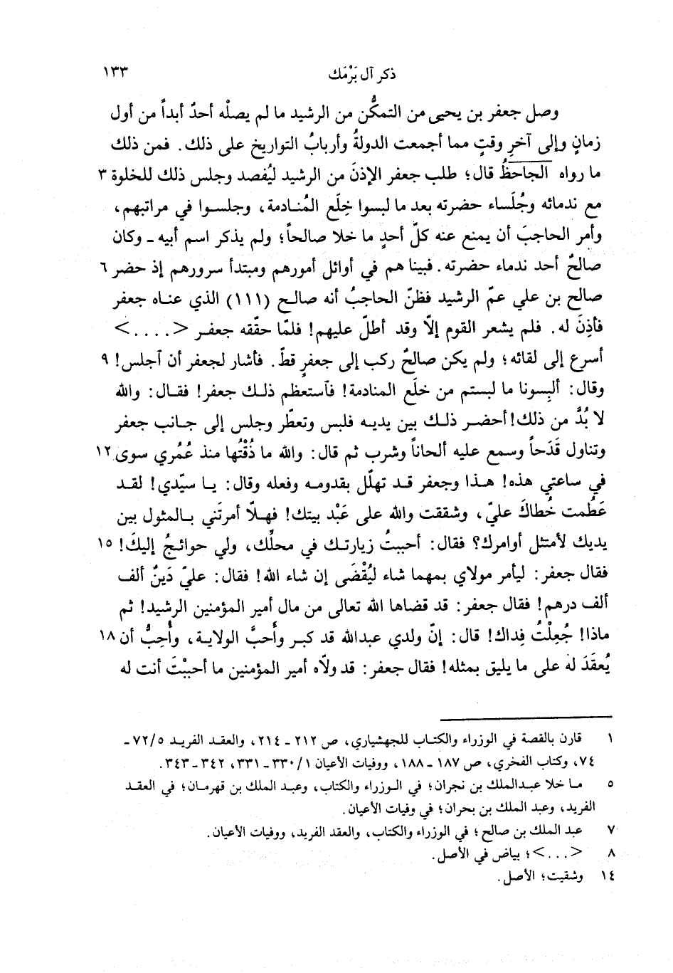 وصل جعفر بن يحيى من التمكّن من الرشيد ما لم يصله أحد أبدا من أول زمان وإلى آخر وقت مما أجمعت الدولة وأرباب التواريخ على ذلك. فمن ذلك ما رواه الجاحظ قال؛ طلب جعفر الإذن من الرشيد ليفصد وجلس ذلك للخلوة مع ندمائه وجلساء حضرته بعد ما لبسوا خلع المنادمة، وجلسوا في مراتبهم، وأمر الحاجب أن يمنع عنه كلّ أحد ما خلا صالحا؛ ولم يذكر اسم أبيه-وكان صالح أحد ندماء حضرته. فبينا هم في أوائل أمورهم ومبتدأ سرورهم إذ حضر صالح بن علي عمّ الرشيد فظنّ الحاجب أنه صالح (111) الذي عناه جعفر فأذن له. فلم يشعر القوم إلاّ وقد أطلّ عليهم! فلمّا حقّقه جعفر < .... > أسرع إلى لقائه؛ ولم يكن صالح ركب إلى جعفر قطّ. فأشار لجعفر أن اجلس! وقال: ألبسونا ما لبستم من خلع المنادمة! فاستعظم ذلك جعفر! فقال: والله لا بدّ من ذلك! أحضر ذلك بين يديه فلبس وتعطّر وجلس إلى جانب جعفر وتناول قدحا وسمع عليه ألحانا وشرب ثم قال: والله ما ذقتها منذ عمري سوى في ساعتي هذه! هذا وجعفر قد تهلّل بقدومه وفعله وقال: يا سيّدي! لقد عطمت خطاك عليّ، وشققت والله على عبد بيتك! فهلاّ أمرتني بالمثول بين يديك لأمتثل أوامرك؟ فقال: أحببت زيارتك في محلّك، ولي حوائج إليك! فقال جعفر: ليأمر مولاي بمهما شاء ليقضى إن شاء الله! فقال: عليّ دين ألف ألف درهم! فقال جعفر: قد قضاها الله تعالى من مال أمير المؤمنين الرشيد! ثم ماذا! جعلت فداك! قال: إنّ ولدي عبد الله قد كبر وأحبّ الولاية، وأحبّ أن يعقد له على ما يليق بمثله! فقال جعفر: قد ولاّه أمير المؤمنين ما أحببت أنت له