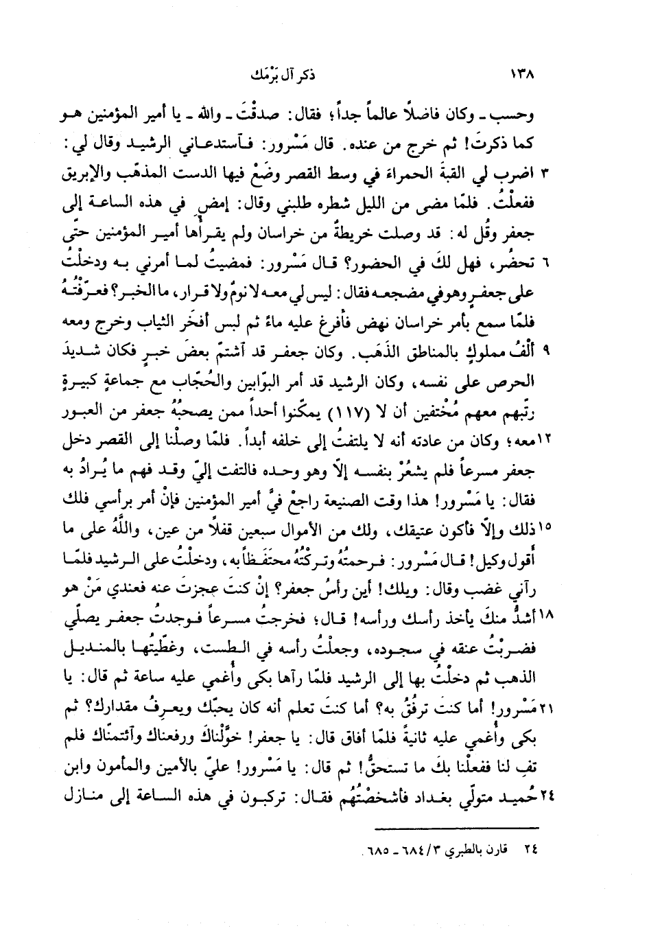 اضرب لي القبة الحمراء في وسط القصر وضع فيها الدست المذهّب والإبريق ففعلت. فلمّا مضى من الليل شطره طلبني وقال: إمض في هذه الساعة إلى جعفر وقل له: قد وصلت خريطة من خراسان ولم يقرأها أمير المؤمنين حتّى تحضر، فهل لك في الحضور؟ قال مسرور: فمضيت لما أمرني به ودخلت على جعفر وهو في مضجعه فقال: ليس لي معه لا نوم ولا قرار، ما الخبر؟ فعرّفته فلمّا سمع بأمر خراسان نهض فأفرغ عليه ماء ثم لبس أفخر الثياب وخرج ومعه ألف مملوك بالمناطق الذهب. وكان جعفر قد اشتمّ بعض خبر فكان شديد الحرص على نفسه، وكان الرشيد قد أمر البوّابين والحجّاب مع جماعة كبيرة رتّبهم معهم مختفين أن لا (117) يمكّنوا أحدا ممن يصحبه جعفر من العبور معه؛ وكان من عادته أنه لا يلتفت إلى خلفه أبدا. فلمّا وصلنا إلى القصر دخل جعفر مسرعا فلم يشعر بنفسه إلاّ وهو وحده فالتفت إليّ وقد فهم ما يراد به فقال: يا مسرور! هذا وقت الصنيعة راجع فيّ أمير المؤمنين فإن أمر برأسي فلك ذلك وإلاّ فأكون عتيقك، ولك من الأموال سبعين قفلا من عين، والله على ما أقول وكيل! قال مسرور: فرحمته وتركته محتفظا به، ودخلت على الرشيد فلمّا رآني غضب وقال: ويلك! أين رأس جعفر؟ إن كنت عجزت عنه فعندي من هو أشدّ منك يأخذ رأسك ورأسه! قال؛ فخرجت مسرعا فوجدت جعفر يصلّي فضربت عنقه في سجوده، وجعلت رأسه في الطست، وغطّيتها بالمنديل الذهب ثم دخلت بها إلى الرشيد فلمّا رآها بكى وأغمي عليه ساعة ثم قال: يا مسرور! أما كنت ترفق به؟ أما كنت تعلم أنه كان يحبّك ويعرف مقدارك؟ ثم بكى وأغمي عليه ثانية فلمّا أفاق قال: يا جعفر! خوّلناك ورفعناك وائتمنّاك فلم تف لنا ففعلنا بك ما تستحقّ! ثم قال: يا مسرور! عليّ بالأمين والمأمون وابن حميد متولّي بغداد فأشخصتهم فقال: تركبون في هذه الساعة إلى منازل