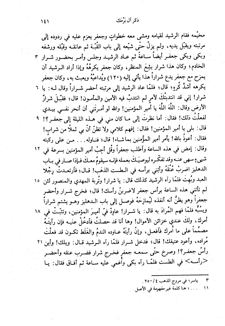 مخيّمه فقام الرشيد لقيامه ومشى معه خطوات وجعفر يعزم عليه في ردوده إلى مرتبته ويقبّل يديه، ولم يزل حتّى شيّعه إلى باب القبّة ثم عانقه وقبّله ورشفه وبكى وبكى جعفر أيضا ساعة ثم عاد الرشيد وجلس وأمر بحضور شرار الخادم؛ وكان هذا شرار بشع المنظر، وكان جعفر يكرهه وإذا أراد الرشيد أن يمزح مع جعفر يدع شرارا هذا يأتي إليه (120) ويداعبه ويعبث به، وكان جعفر يكرهه أشدّ كره؛ قال؛ فلمّا عاد الرشيد إلى مرتبته أحضر شرارا وقال له: يا شرار! إني قد انتدبتك لأمر لم انتدب فيه الأمين والمأمون! قال؛ فقبّل شرار الأرض وقال: الله الله يا أمير المؤمنين! والله لو أمرتني أن أنحر نفسي بيدي لفعلت ذلك! فقال: أما نظرت إلى ما كان مني في هذه الليلة إلى جعفر؟! قال: بلى يا أمير المؤمنين! فقال: إفهم كلامي ولا تظنّ أنّ بي ثملا من شراب! فقال: أعوذ بالله! يأمر أمير المؤمنين بما شاء! قال؛ فناوله ... من على ركبته وقال: إمض في هذه الساعة واطلب جعفرا وقل أجب أمير المؤمنين بسرعة في شيئ سهى عنه وقد تفكّره ليوصيك بعمله فإنه سيقوم معك فإذا صار في باب الدهليز اضرب عنقه وأتني برأسه في الطست الذهب! قال؛ فارتعدت رجلا العبد وبهت فلمّا رآه الرشيد كذلك قال: يا شرار! وتربة المهدي والمنصور لئن لم تأتني هذه الساعة برأس جعفر لا ضربنّ رأسك! قال؛ فخرج شرار وأحضر جعفرا وهو يظنّ أنه أنفذه ليمازحه فوصل إلى باب الدهليز وهو يشتم شرارا ويسبّه فلمّا فهم المراد به قال: يا شرار! عاود في أمير المؤمنين، وتثبّت في أمرك، ولك عندي خزائن الأموال! وها أنا قد حصلت فادخل عليه فإن رأيته مصمّما على ما أمرك فافعل، وإن رأيته عاوده الندم والغلط تكون قد فعلت مراده، وأعود عتيقك! قال؛ فدخل شرار فلمّا رآه الرشيد قال: ويلك! وأين رأس جعفر؟! وصرخ حتّى سمعه جعفر فخرج شرار فضرب عنقه وأحضر <رأسه> في الطست فلمّا رآه بكى وأغمي عليه ساعة ثم أفاق فقال: يا
