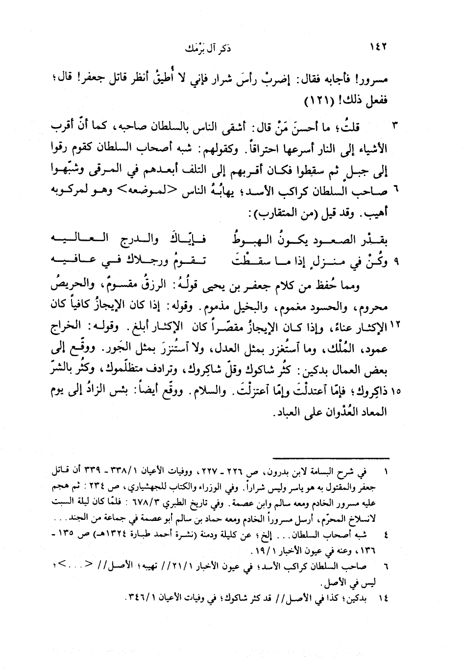 قلت؛ ما أحسن من قال: أشقى الناس بالسلطان صاحبه، كما أنّ أقرب الأشياء إلى النار أسرعها احتراقا. وكقولهم: شبه أصحاب السلطان كقوم رقوا إلى جبل ثم سقطوا فكان أقربهم إلى التلف أبعدهم في المرقى وشبّهوا صاحب السلطان كراكب الأسد؛ يهابه الناس <لموضعه> وهو لمركوبه أهيب. وقد قيل (من المتقارب):