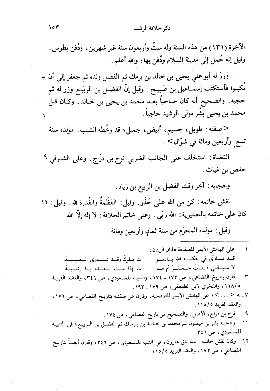 <صفته: طويل، جسيم، أبيض، جميل؛ قد وخّطه الشيب. مولده سنة تسع وأربعين ومائة في شوّال>.