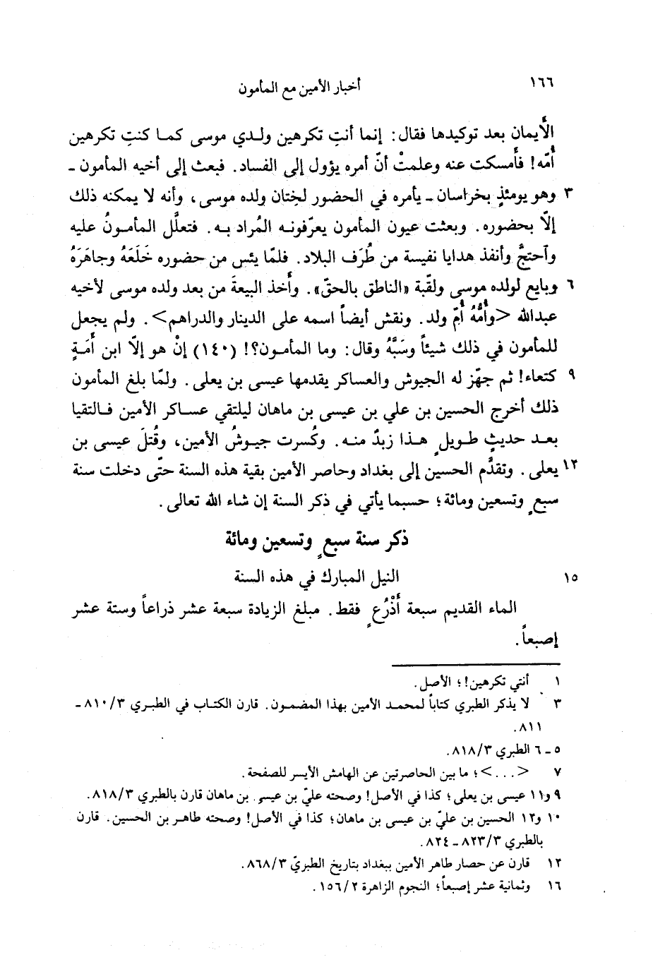 الأيمان بعد توكيدها فقال: إنما أنت تكرهين ولدي موسى كما كنت تكرهين أمّه! فأمسكت عنه وعلمت أنّ أمره يؤول إلى الفساد. فبعث إلى أخيه المأمون- وهو يومئذ بخراسان-يأمره في الحضور لختان ولده موسى، وأنه لا يمكنه ذلك إلاّ بحضوره. وبعثت عيون المأمون يعرّفونه المراد به. فتعلّل المأمون عليه واحتجّ وأنفذ هدايا نفيسة من طرف البلاد. فلمّا يئس من حضوره خلعه وجاهره وبايع لولده موسى ولقّبة «الناطق بالحقّ».وأخذ البيعة من بعد ولده موسى لأخيه عبد الله <وأمّه أمّ ولد. ونقش أيضا اسمه على الدينار والدراهم>.ولم يجعل للمأمون في ذلك شيئا وسبّه وقال: وما المأمون؟! (140) إن هو إلاّ ابن أمة كتعاء! ثم جهّز له الجيوش والعساكر يقدمها عيسى بن يعلى. ولمّا بلغ المأمون ذلك أخرج الحسين بن علي بن عيسى بن ماهان ليلتقي عساكر الأمين فالتقيا بعد حديث طويل هذا زبد منه. وكسرت جيوش الأمين، وقتل عيسى بن يعلى. وتقدّم الحسين إلى بغداد وحاصر الأمين بقية هذه السنة حتّى دخلت سنة سبع وتسعين ومائة؛ حسبما يأتي في ذكر السنة إن شاء الله تعالى.
