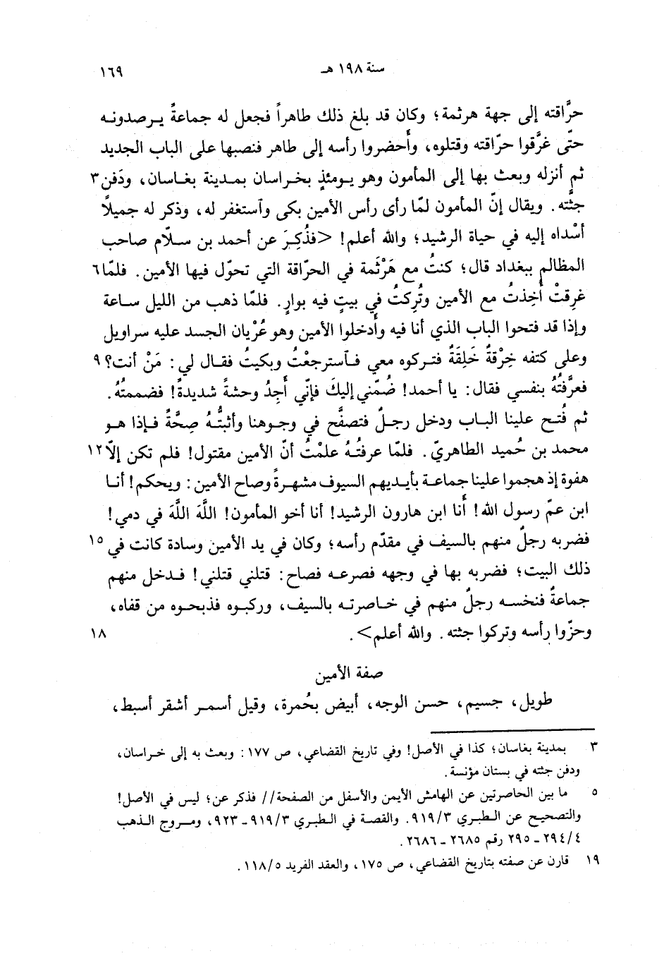 ثم فتح علينا الباب ودخل رجل فتصفّح في وجوهنا وأثبتّه صحّة فإذا هو محمد بن حميد الطاهريّ. فلمّا عرفته علمت أنّ الأمين مقتول! فلم تكن إلاّ هفوة إذ هجموا علينا جماعة بأيديهم السيوف مشهرة وصاح الأمين: ويحكم! أنا ابن عمّ رسول الله! أنا ابن هارون الرشيد! أنا أخو المأمون! الله الله في دمي! فضربه رجل منهم بالسيف في مقدّم رأسه؛ وكان في يد الأمين وسادة كانت في ذلك البيت؛ فضربه بها في وجهه فصرعه فصاح: قتلني قتلني! فدخل منهم جماعة فنخسه رجل منهم في خاصرته بالسيف، وركبوه فذبحوه من قفاه، وحزّوا رأسه وتركوا جثته. والله أعلم>.