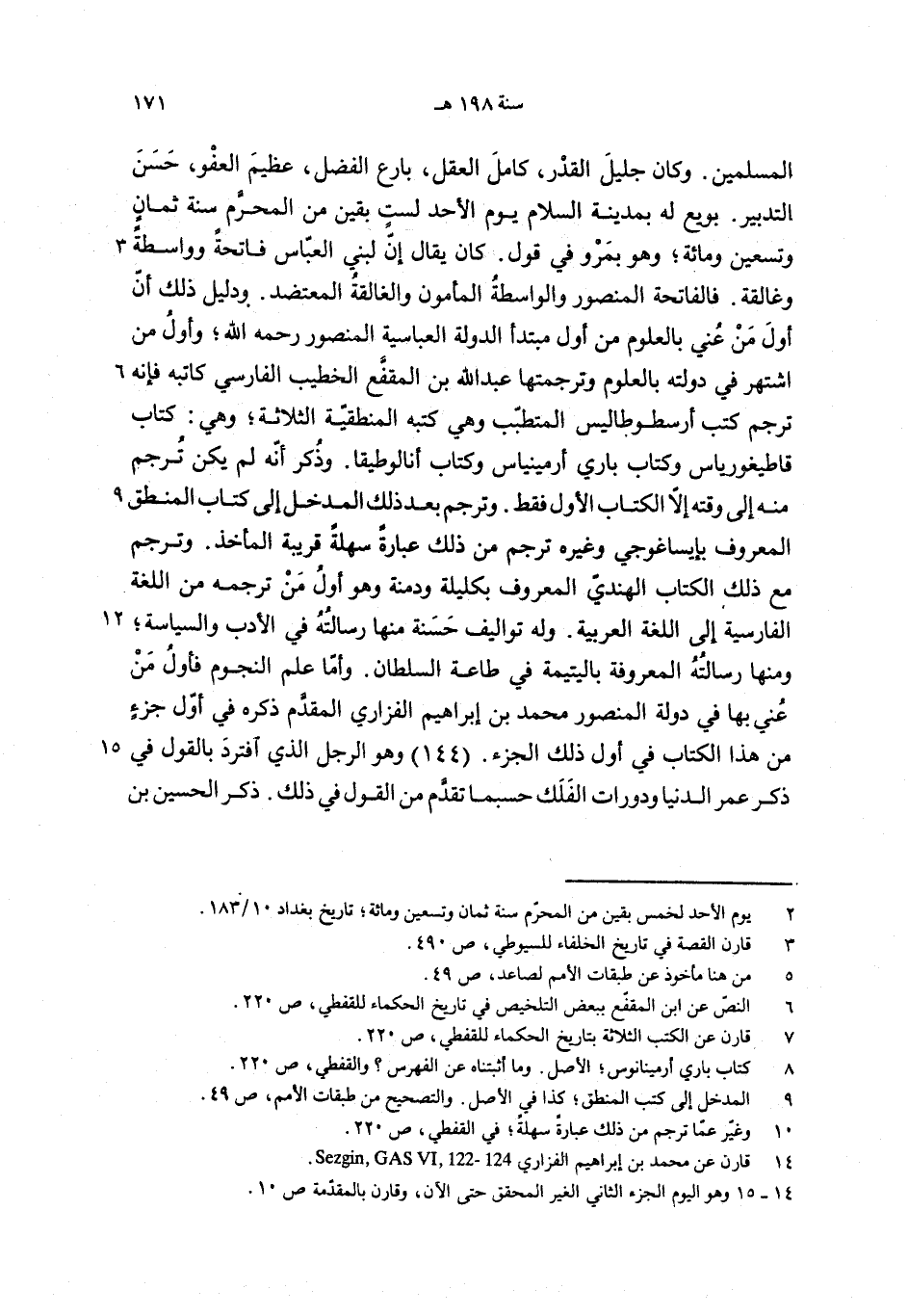 المسلمين. وكان جليل القدر، كامل العقل، بارع الفضل، عظيم العفو، حسن التدبير. بويع له بمدينة السلام يوم الأحد لست بقين من المحرّم سنة ثمان وتسعين ومائة؛ وهو بمرو في قول. كان يقال إنّ لبني العبّاس فاتحة وواسطة وغالقة. فالفاتحة المنصور والواسطة المأمون والغالقة المعتضد. ودليل ذلك أنّ أول من عني بالعلوم من أول مبتدأ الدولة العباسية المنصور رحمه الله؛ وأول من اشتهر في دولته بالعلوم وترجمتها عبد الله بن المقفّع الخطيب الفارسي كاتبه فإنه ترجم كتب أرسطوطاليس المتطبّب وهي كتبه المنطقيّة الثلاثة؛ وهي: كتاب قاطيغورياس وكتاب باري أرمينياس وكتاب أنالوطيقا. وذكر أنّه لم يكن ترجم منه إلى وقته إلاّ الكتاب الأول فقط. وترجم بعد ذلك المدخل إلى كتاب المنطق المعروف بإيساغوجي وغيره ترجم من ذلك عبارة سهلة قريبة المأخذ. وترجم مع ذلك الكتاب الهنديّ المعروف بكليلة ودمنة وهو أول من ترجمه من اللغة الفارسية إلى اللغة العربية. وله تواليف حسنة منها رسالته في الأدب والسياسة؛ ومنها رسالته المعروفة باليتيمة في طاعة السلطان. وأمّا علم النجوم فأول من عني بها في دولة المنصور محمد بن إبراهيم الفزاري المقدّم ذكره في أوّل جزء من هذا الكتاب في أول ذلك الجزء. (144) وهو الرجل الذي افترد بالقول في ذكر عمر الدنيا ودورات الفلك حسبما تقدّم من القول في ذلك. ذكر الحسين بن