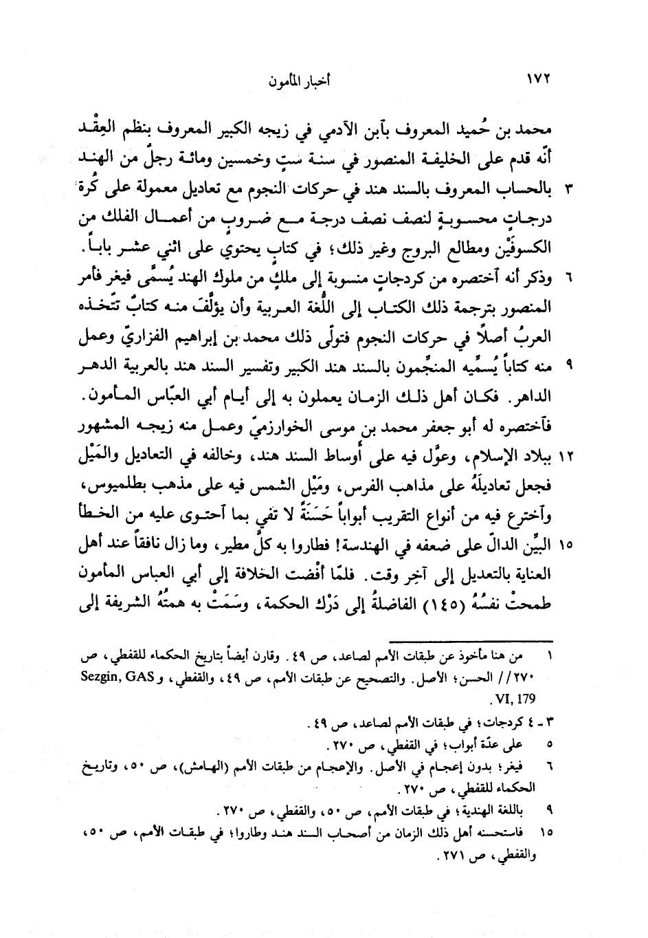 فاختصره له أبو جعفر محمد بن موسى الخوارزميّ وعمل منه زيجه المشهور ببلاد الإسلام، وعوّل فيه على أوساط السند هند، وخالفه في التعاديل والميل فجعل تعاديله على مذاهب الفرس، وميل الشمس فيه على مذهب بطلميوس، واخترع فيه من أنواع التقريب أبوابا حسنة لا تفي بما احتوى عليه من الخطأ البيّن الدالّ على ضعفه في الهندسة! فطاروا به كلّ مطير، وما زال نافقا عند أهل العناية بالتعديل إلى آخر وقت. فلمّا أفضت الخلافة إلى أبي العباس المأمون طمحت نفسه (145) الفاضلة إلى درك الحكمة، وسمت به همته الشريفة إلى