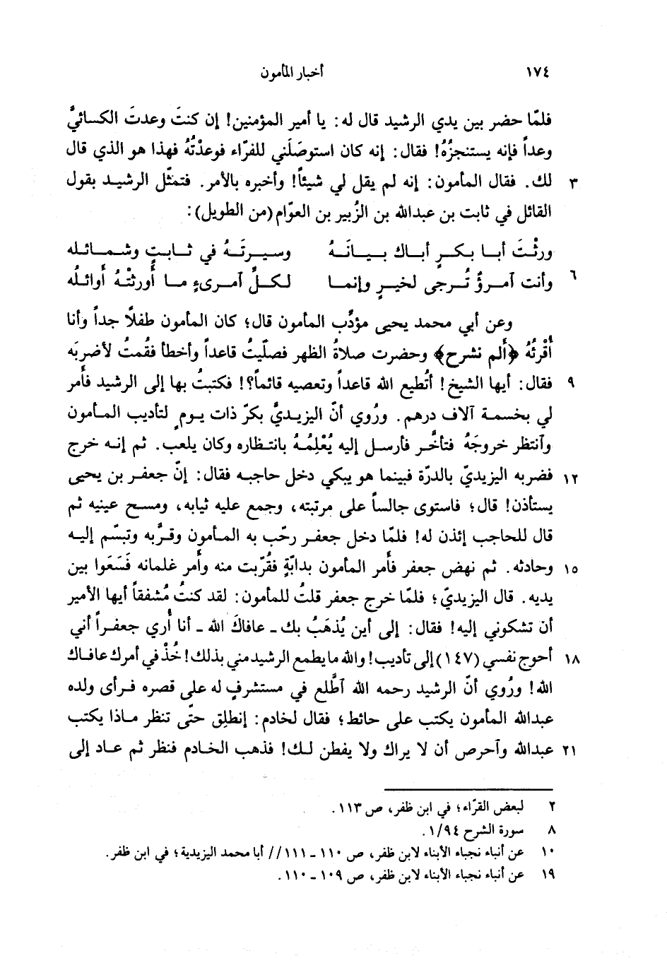 فلمّا حضر بين يدي الرشيد قال له: يا أمير المؤمنين! إن كنت وعدت الكسائي وعدا فإنه يستنجزه! فقال: إنه كان استوصلني للفرّاء فوعدته فهذا هو الذي قال لك. فقال المأمون: إنه لم يقل لي شيئا! وأخبره بالأمر. فتمثّل الرشيد بقول القائل في ثابت بن عبد الله بن الزبير بن العوّام (من الطويل):