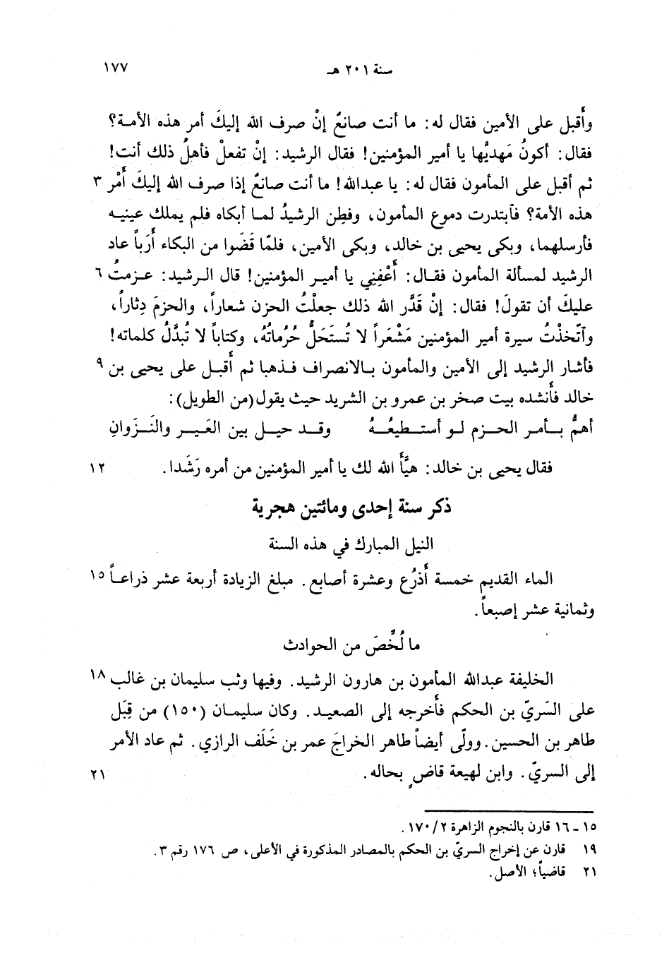 الخليفة عبد الله المأمون بن هارون الرشيد. وفيها وثب سليمان بن غالب على السريّ بن الحكم فأخرجه إلى الصعيد. وكان سليمان (150) من قبل طاهر بن الحسين. وولّى أيضا طاهر الخراج عمر بن خلف الرازي. ثم عاد الأمر إلى السريّ. وابن لهيعة قاض بحاله.
