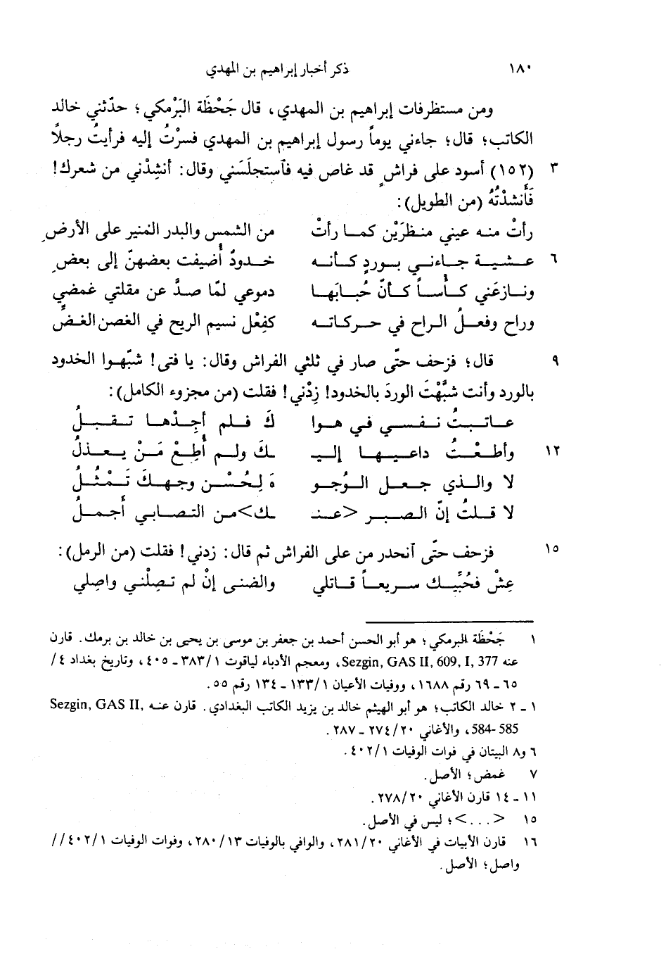 ومن مستظرفات إبراهيم بن المهدي، قال جحظة البرمكي؛ حدّثني خالد الكاتب؛ قال؛ جاءني يوما رسول إبراهيم بن المهدي فسرت إليه فرأيت رجلا (152) أسود على فراش قد غاص فيه فاستجلسني وقال: أنشدني من شعرك! فأنشدته (من الطويل):