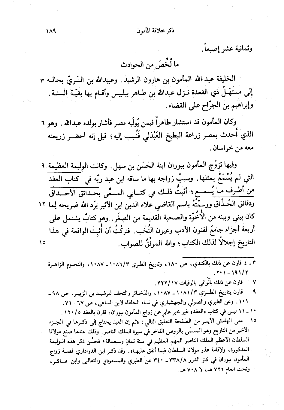 وفيها تزوّج المأمون ببوران ابنة الحسن بن سهل. وكانت الوليمة العظيمة التي لم يسمع بمثلها. وسبب زواجه بها ما ساقه ابن عبد ربّه في كتاب العقد من أطرف ما يسمع؛ أثبتّ ذلك في كتابي المسمّى بحدائق الأحداق ودقائق الحذّاق ووسمته باسم القاضي علاء الدين ابن الأثير برّد الله ضريحه لما كان بيني وبينه من الأخوّة والصحبة القديمة من الصغر. وهو كتاب يشتمل على أربعة أجزاء جامع لفنون الأدب وعيون النخب. فتركت أن أثبت الواقعة في هذا التاريخ إجلالا لذلك الكتاب؛ والله الموفّق للصواب.