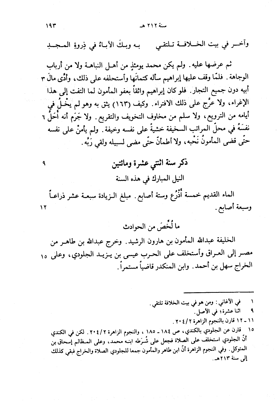 ثم عرضها عليه. ولم يكن محمد يومئذ من أهل النباهة ولا من أرباب الوجاهة. فلمّا وقف عليها إبراهيم سأله كتمانها واستحلفه على ذلك، وأدّى مال أبيه دون جميع التجار. فلو كان إبراهيم واثقا بعفو المأمون لما التفت إلى هذا الإغراء، ولا عرّج على ذلك الافتراء. وكيف (163) يثق به وهو لم يخل في أيامه من الترويع، ولا سلم من مخاوف التخويف والتقريع. ولا جرم أنه أحلّ نفسه في محلّ المراتب السخيفة خشية على نفسه وخيفة. ولم يأمن على نفسه حتّى قضى المأمون نحبه، ولا اطمأنّ حتّى مضى لسبيله ولقي ربّه.