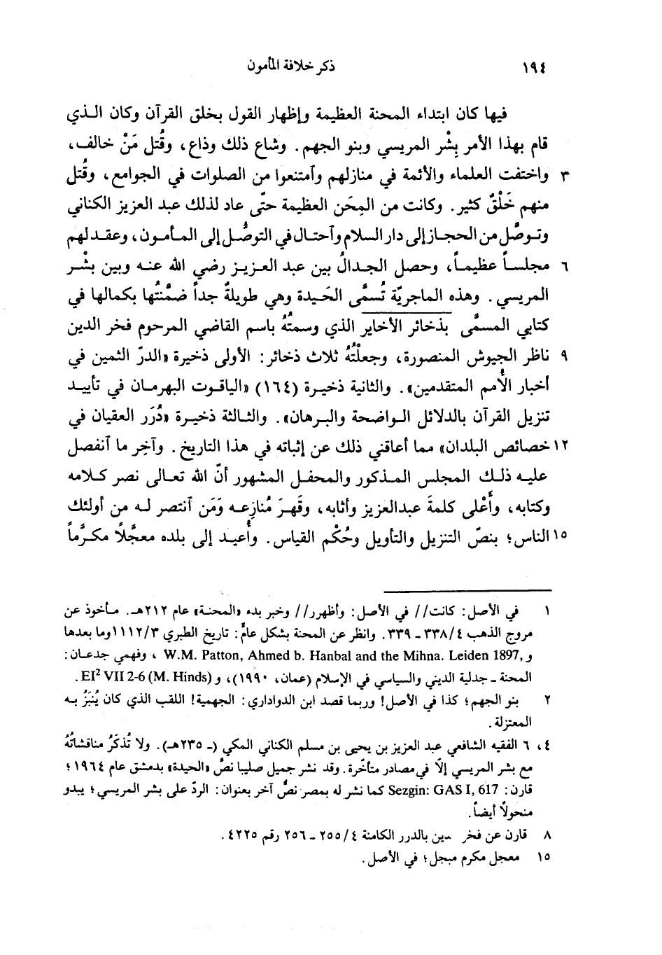 فيها كان ابتداء المحنة العظيمة وإظهار القول بخلق القرآن وكان الذي قام بهذا الأمر بشر المريسي وبنو الجهم. وشاع ذلك وذاع، وقتل من خالف، واختفت العلماء والأئمة في منازلهم وامتنعوا من الصلوات في الجوامع، وقتل منهم خلق كثير. وكانت من المحن العظيمة حتّى عاد لذلك عبد العزيز الكناني وتوصّل من الحجاز إلى دار السلام واحتال في التوصّل إلى المأمون، وعقد لهم مجلسا عظيما، وحصل الجدال بين عبد العزيز رضي الله عنه وبين بشر المريسي. وهذه الماجريّة تسمّى الحيدة وهي طويلة جدا ضمّنتها بكمالها في كتابي المسمّى بذخائر الأخاير الذي وسمته باسم القاضي المرحوم فخر الدين ناظر الجيوش المنصورة، وجعلته ثلاث ذخائر: الأولى ذخيرة «الدرّ الثمين في أخبار الأمم المتقدمين».والثانية ذخيرة (164) «الياقوت البهرمان في تأييد تنزيل القرآن بالدلائل الواضحة والبرهان».والثالثة ذخيرة «درر العقيان في خصائص البلدان» مما أعاقني ذلك عن إثباته في هذا التاريخ. وآخر ما انفصل عليه ذلك المجلس المذكور والمحفل المشهور أنّ الله تعالى نصر كلامه وكتابه، وأعلى كلمة عبد العزيز وأثابه، وقهر منازعه ومن انتصر له من أولئك الناس؛ بنصّ التنزيل والتأويل وحكم القياس. وأعيد إلى بلده معجّلا مكرّما