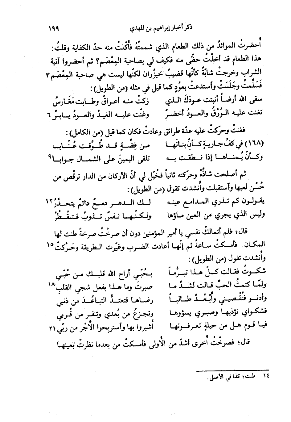 قال؛ فلم أتمالك نفسي يا أمير المؤمنين دون أن صرخت صرخة طنت لها المكان. فأمسكت ساعة ثم إنّها أعادت الضرب وغيّرت الطريقة وحرّكت وأنشدت تقول (من الطويل):