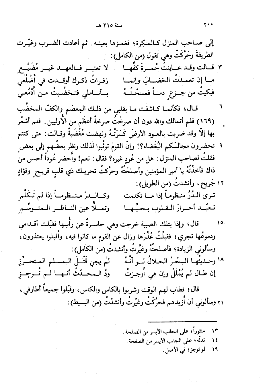 قال؛ فكأنما كاشفت ما بقلبي من ذلك المعصم والكفّ المخضّب (169) فلم أتمالك والله دون أن صرخت صرخة أعظم من الأوليين. فلم أشعر بها إلاّ وقد ضربت بالعود الأرض كسرته ونهضت مغضبة وقالت: متى كنتم تحضرون مجالسكم البغضاء؟! وإنّ القوم توثّبوا لذلك ونظر بعضهم إلى بعض فقلت لصاحب المنزل: هل من عود غيره؟ فقال: نعم! وأحضر عودا أحسن من ذاك فأخذته يا أمير المؤمنين وأصلحته وحرّكت تحريك ذي قلب قريح وفؤاد جريح، وأنشدت (من الطويل):