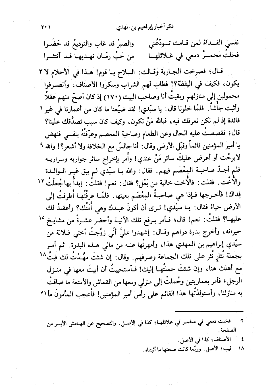 قال؛ فصرخت الجارية وقالت: السلاح يا قوم! هذا في الأحلام لا يكون، فكيف في اليقظة؟! فطاب لهم الشراب وسكروا الأصناف، وانصرفوا محمولين إلى منازلهم وبقيت أنا وصاحب البيت (170) إذ كان أصحّ منهم عقلا وأثبت جأشا. فلمّا خلونا قال: يا سيّدي! لقد ضيّعنا ما كان من أعمارنا في غير فائدة إذ لم نكن نعرفك فيه، فيالله من تكون، وكيف كان سبب تصدّقك علينا؟ قال؛ فقصصت عليه الحال وعن الطعام وصاحبة المعصم وعرّفته بنفسي فنهض يا أمير المؤمنين قائما وقبّل الأرض وقال: أنا جالس مع الخلافة ولا أشعر؟! والله لا برحت أو أعرض عليك سائر من عندي! وأمر بإخراج سائر جواريه وسراريه فلم أجد صاحبة المعصم فيهم. فقال: والله يا سيّدي لم يبق غير الوالدة والأخت. فقلت: فالأخت خالية من بعل؟ فقال: نعم! فقلت: إبدأ بها جعلت فداك! فأخرجها فإذا هي صاحبة المعصم بعينها. فلمّا عرفتها أطرقت إلى الأرض حياء فقال: يا سيّدي! ترى أن أكون عبدك وهي أمتك؟ وأعقد لك عليها؟ فقلت: نعم! قال؛ فأمر برفع تلك الآنية وأحضر عشرة من مشايخ جيرانه، وأخرج بدرة دراهم وقال: إشهدوا عليّ أنّي زوّجت أختي فلانة من سيّدي إبراهيم بن المهدي هذا، وأمهرتها عنه من مالي هذه البدرة. ثم أمر بجملة نثار نثر على تلك الجماعة وصرفهم. وقال: إن شئت مهّدت لك فبتّ مع أهلك هنا، وإن شئت حملتها إليك! فاستحييت أن أبيت معها في منزل الرجل؛ فأمر بعماريتين وحملت إلى منزلي ومعها من القماش والأمتعة ما ضاقت به منازلنا، واستولدتها هذا القائم على رأس أمير المؤمنين! فأعجب المأمون م