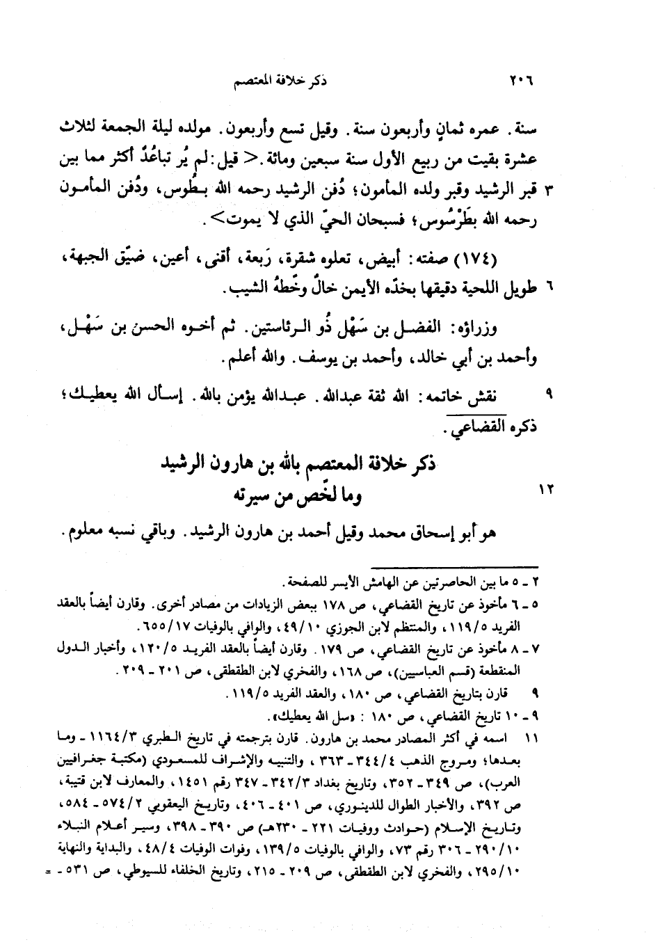 (174) صفته: أبيض، تعلوه شقرة، ربعة، أقنى، أعين، ضيّق الجبهة، طويل اللحية دقيقها بخدّه الأيمن خال وخّطه الشيب.