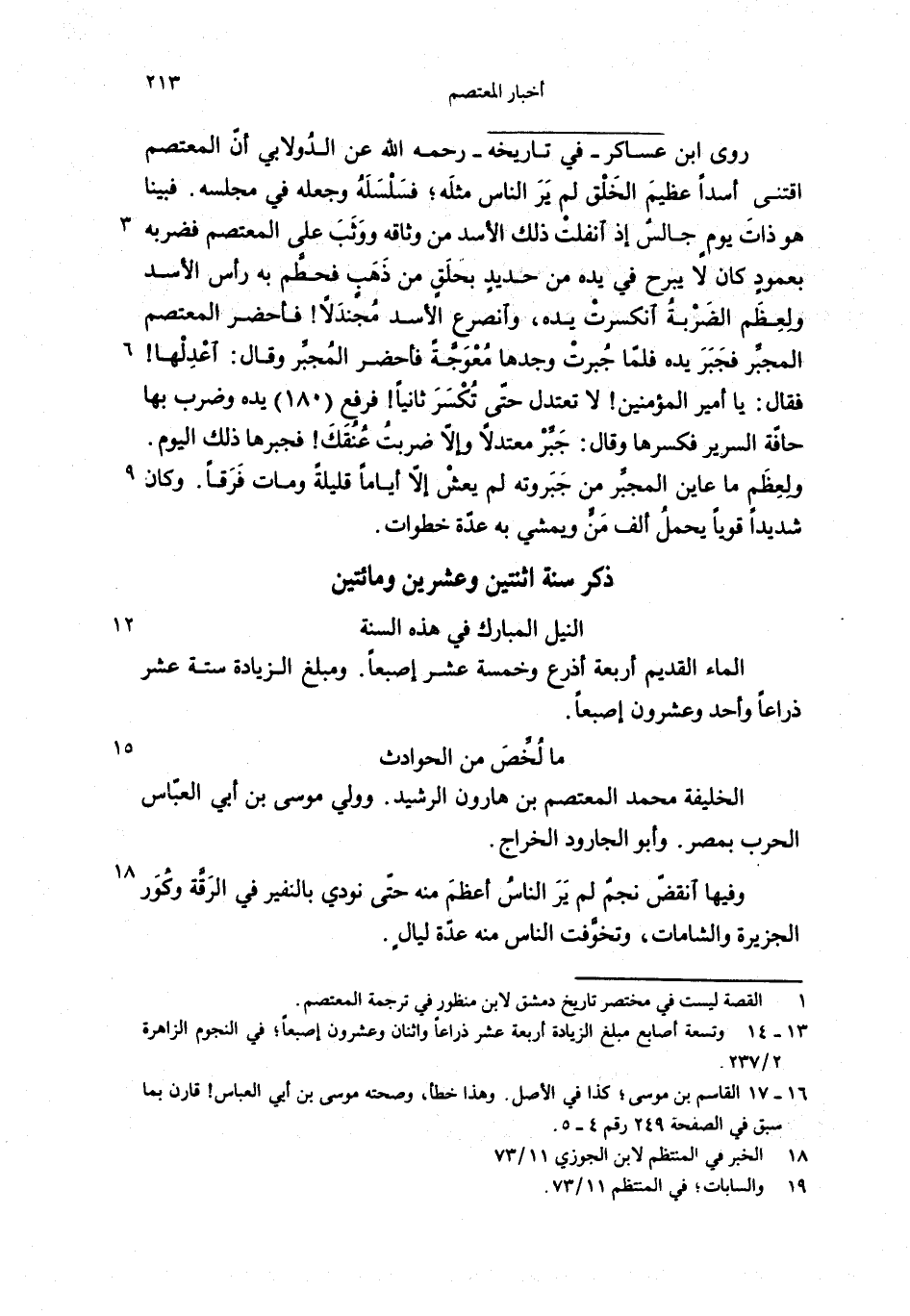 روى ابن عساكر-في تاريخه-رحمه الله عن الدولابي أنّ المعتصم اقتنى أسدا عظيم الخلق لم ير الناس مثله؛ فسلسله وجعله في مجلسه. فبينا هو ذات يوم جالس إذ انفلت ذلك الأسد من وثاقه ووثب على المعتصم فضربه بعمود كان لا يبرح في يده من حديد بحلق من ذهب فحطّم به رأس الأسد ولعظم الضربة انكسرت يده، وانصرع الأسد مجندلا! فأحضر المعتصم المجبّر فجبر يده فلمّا جبرت وجدها معوجّة فأحضر المجبّر وقال: اعدلها! فقال: يا أمير المؤمنين! لا تعتدل حتّى تكسر ثانيا! فرفع (180) يده وضرب بها حافّة السرير فكسرها وقال: جبّر معتدلا وإلاّ ضربت عنقك! فجبرها ذلك اليوم.