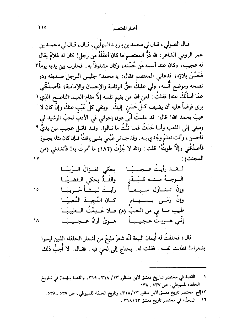 قال الصولي، قال لي محمد بن يزيد المهلّبي، قال، قال لي محمد بن عمر الرومي الشاعر: لله درّ المعتصم ما كان أعقله من رجل! كان له غلام يقال له عجيب، وكان عند اسمه من حسنه، وكان مشغوفا به. فحارب بين يديه يوما فحسن بلاؤه؛ فدعاني المعتصم فقال: يا محمد! جليس الرجل صديقه وذو نصحه وموضع أنسه، ولي عليك حقّ الرئاسة والإحسان والإمامة؛ فاصدقني عمّا أسألك عنه! فقلت: لعن الله من يقيم نفسه إلاّ مقام العبد الناصح الذي يرى فرضا عليه أن يضيف كلّ حسن إليك. وينفي كلّ عيب عنك وإن كان لا عيب بحمد الله! قال: قد علمت أنّي دون إخواني في الأدب لحبّ الرشيد لي وميلي إلى اللعب وأنا حدث فما نلت ما نالوا. وقد قاتل عجيب بين يديّ فأحسن، وأنت تعلم وجدي به. وقد جاش طبعي بشيئ قلته فإن كان مثله يجوز فاصدقني وإلاّ طويته! قلت: والله لا جزت (182) ما أمرت به! فأنشدني (من المجتث):