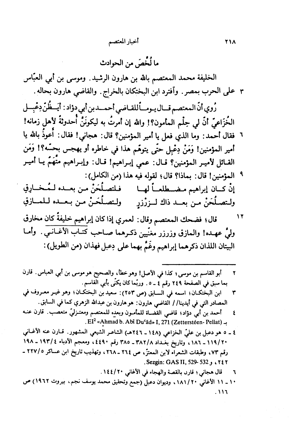 قال؛ فضحك المعتصم وقال: لعمري إذا كان إبراهيم خليفة كان مخارق وليّ عهده! والمازق وزرزر مغنّيين ذكرهما صاحب كتاب الأغاني. وأما البيتان اللذان ذكرهما إبراهيم وغمّ بهما على دعبل فهذان (من الطويل):