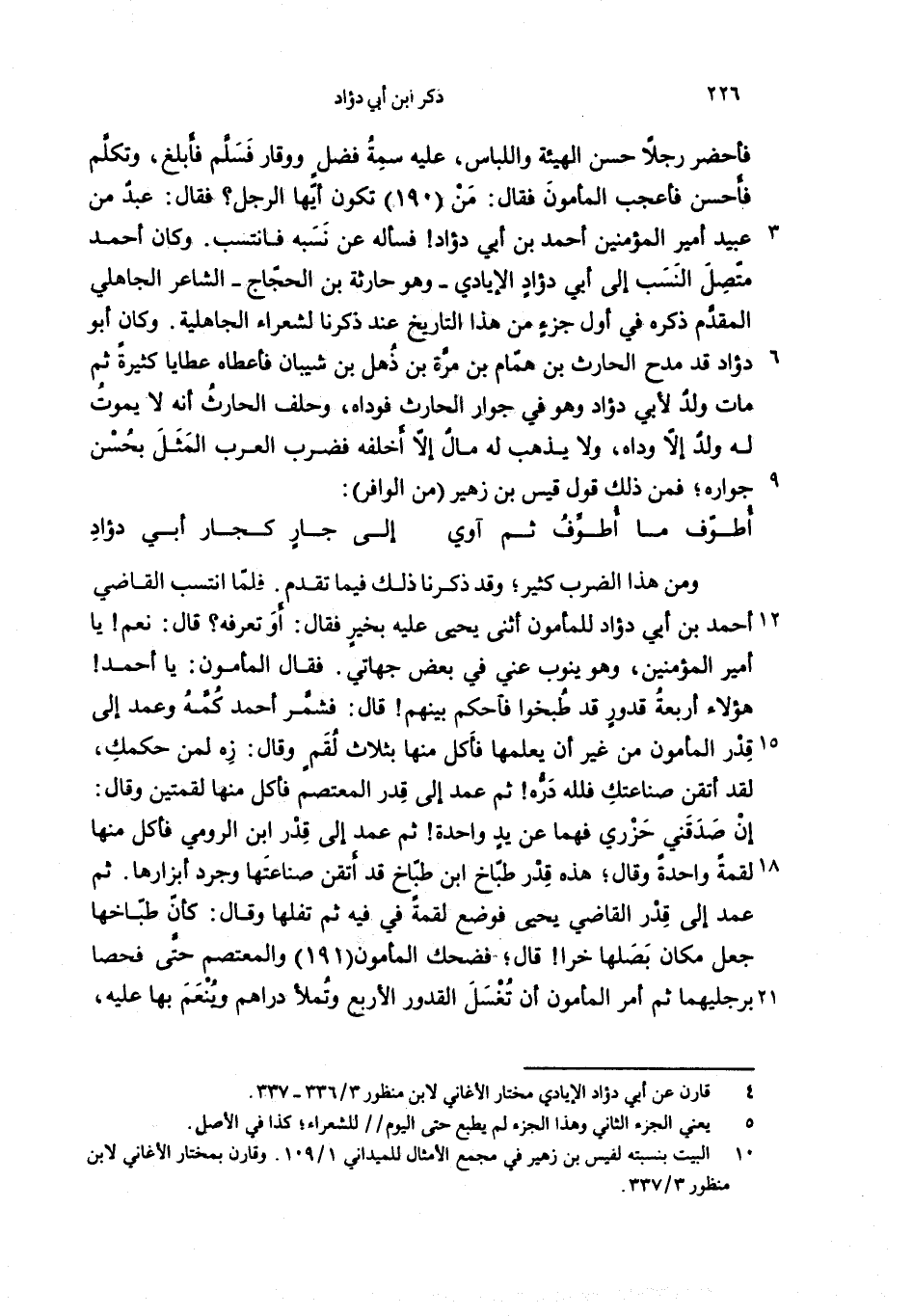 فأحضر رجلا حسن الهيئة واللباس، عليه سمة فضل ووقار فسلّم فأبلغ، وتكلّم فأحسن فأعجب المأمون فقال: من (190) تكون أيّها الرجل؟ فقال: عبد من عبيد أمير المؤمنين أحمد بن أبي دؤاد! فسأله عن نسبه فانتسب. وكان أحمد متّصل النسب إلى أبي دؤاد الإيادي-وهو حارثة بن الحجّاج-الشاعر الجاهلي المقدّم ذكره في أول جزء من هذا التاريخ عند ذكرنا لشعراء الجاهلية. وكان أبو دؤاد قد مدح الحارث بن همّام بن مرّة بن ذهل بن شيبان فأعطاه عطايا كثيرة ثم مات ولد لأبي دؤاد وهو في جوار الحارث فوداه، وحلف الحارث أنه لا يموت له ولد إلاّ وداه، ولا يذهب له مال إلاّ أخلفه فضرب العرب المثل بحسن جواره؛ فمن ذلك قول قيس بن زهير (من الوافر):