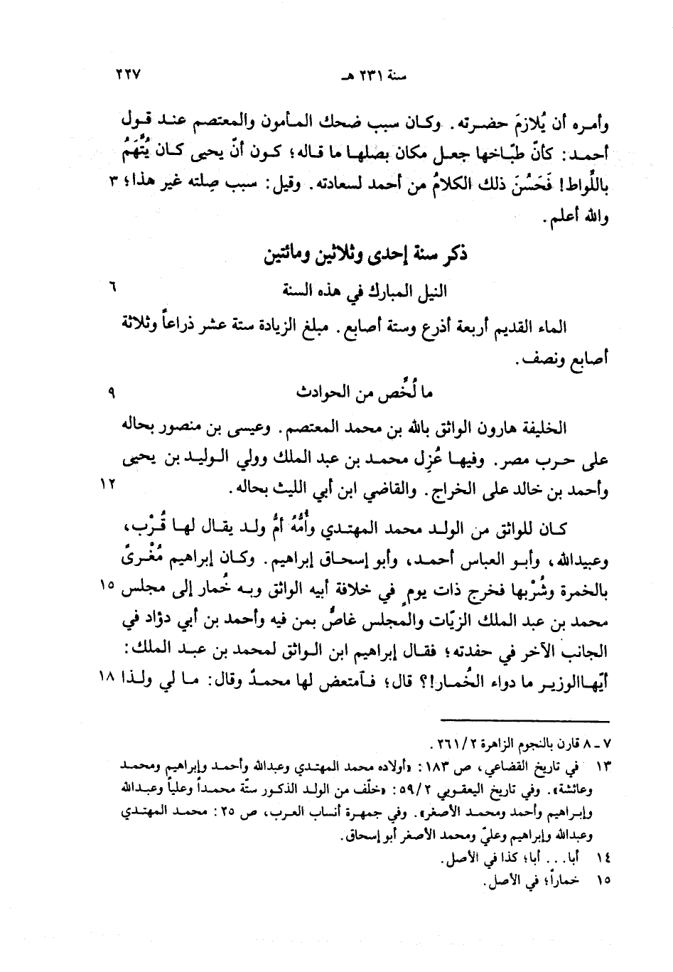 الخليفة هارون الواثق بالله بن محمد المعتصم. وعيسى بن منصور بحاله على حرب مصر. وفيها عزل محمد بن عبد الملك وولي الوليد بن يحيى وأحمد بن خالد على الخراج. والقاضي ابن أبي الليث بحاله.