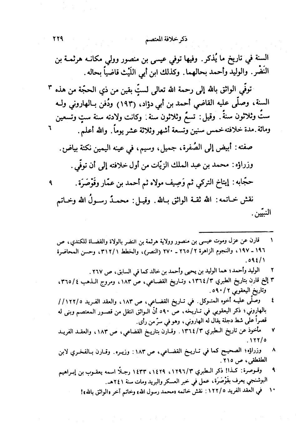 توفّي الواثق بالله إلى رحمة الله تعالى لستّ بقين من ذي الحجّة من هذه السنة، وصلّى عليه القاضي أحمد بن أبي دؤاد، (193) ودفن بالهاروني وله ست وثلاثون سنة. وقيل: تسع وثلاثون سنة. وكانت ولادته سنة ست وتسعين ومائة. مدة خلافته خمس سنين وتسعة أشهر وثلاثة عشر يوما. والله أعلم.