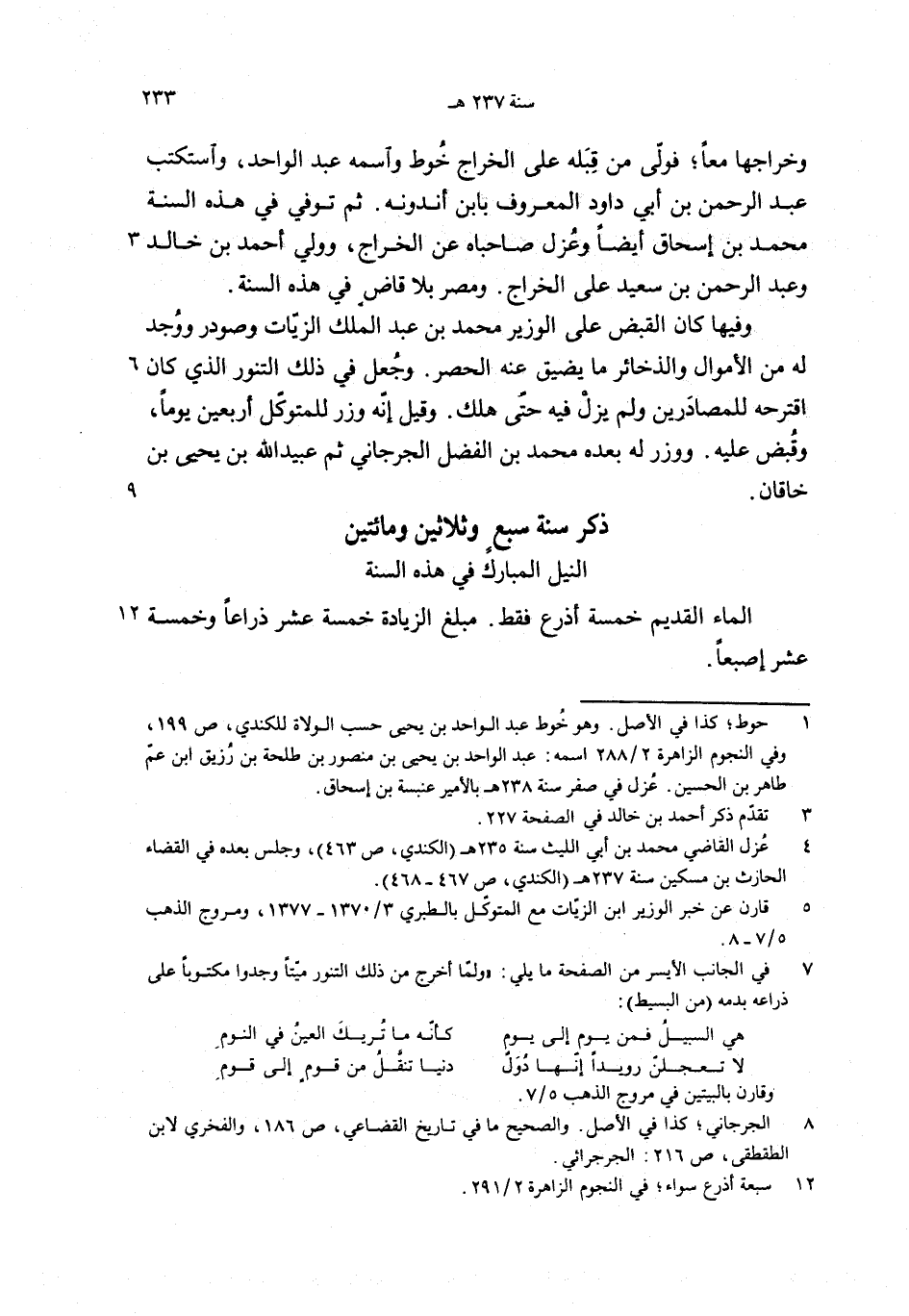 وفيها كان القبض على الوزير محمد بن عبد الملك الزيّات وصودر ووجد له من الأموال والذخائر ما يضيق عنه الحصر. وجعل في ذلك التنور الذي كان اقترحه للمصادرين ولم يزل فيه حتّى هلك. وقيل إنّه وزر للمتوكّل أربعين يوما، وقبض عليه. ووزر له بعده محمد بن الفضل الجرجاني ثم عبيد الله بن يحيى بن خاقان.