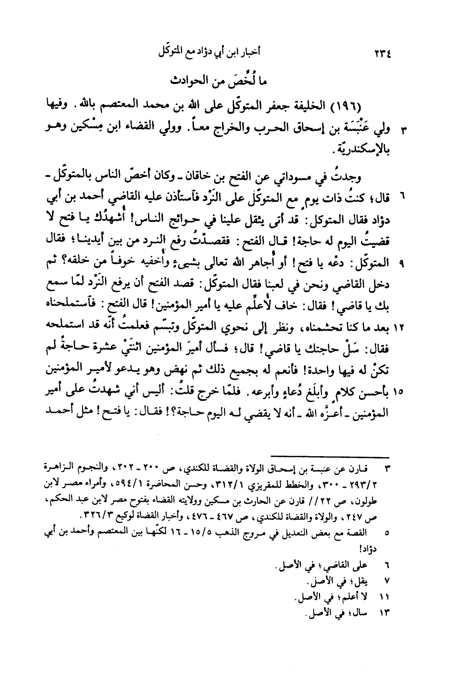 وجدت في مسوداتي عن الفتح بن خاقان-وكان أخصّ الناس بالمتوكّل- قال؛ كنت ذات يوم مع المتوكّل على النرد فاستأذن عليه القاضي أحمد بن أبي دؤاد فقال المتوكل: قد أتى يثقل علينا في حوائج الناس! أشهدك يا فتح لا قضيت اليوم له حاجة! قال الفتح: فقصدت رفع النرد من بين أيدينا؛ فقال المتوكّل: دعه يا فتح! أو أجاهر الله تعالى بشيئ وأخفيه خوفا من خلقه؟ ثم دخل القاضي ونحن في لعبنا فقال المتوكّل: قصد الفتح أن يرفع النرد لمّا سمع بك يا قاضي! فقال: خاف لأعلّم عليه يا أمير المؤمنين! قال الفتح: فاستملحناه بعد ما كنا تحشمناه، ونظر إلى نحوي المتوكّل وتبسّم فعلمت أنّه قد استملحه فقال: سل حاجتك يا قاضي! قال؛ فسأل أمير المؤمنين اثنتي عشرة حاجة لم تكن له فيها واحدة! فأنعم له بجميع ذلك ثم نهض وهو يدعو لأمير المؤمنين بأحسن كلام وأبلغ دعاء وأبرعه. فلمّا خرج قلت: أليس أني شهدت على أمير المؤمنين-أعزّه الله-أنه لا يقضي له اليوم حاجة؟! فقال: يا فتح! مثل أحمد