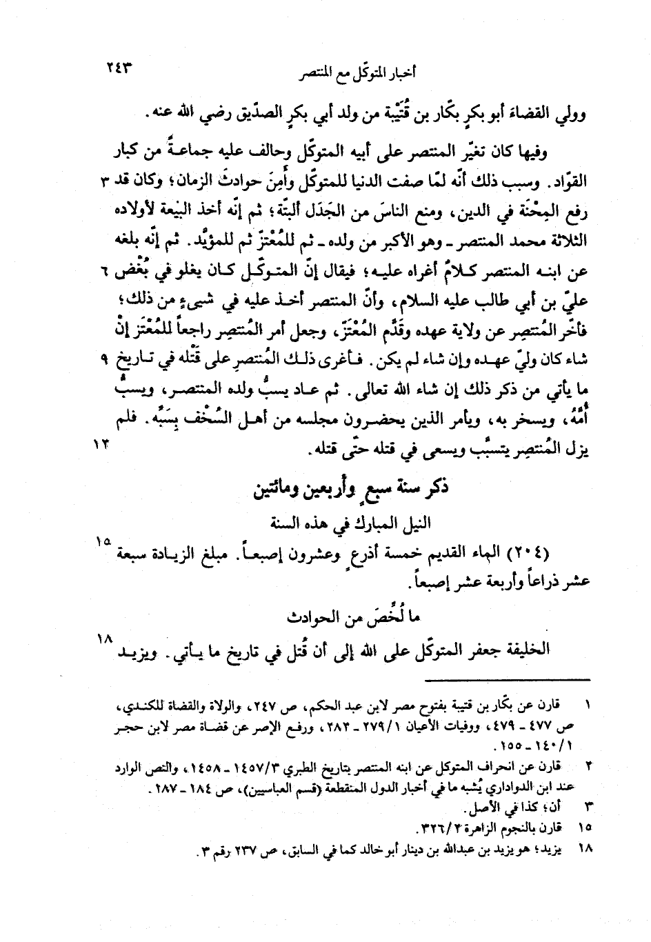 وفيها كان تغيّر المنتصر على أبيه المتوكّل وحالف عليه جماعة من كبار القوّاد. وسبب ذلك أنّه لمّا صفت الدنيا للمتوكّل وأمن حوادث الزمان؛ وكان قد رفع المحنة في الدين، ومنع الناس من الجدل ألبتّة؛ ثم إنّه أخذ البيعة لأولاده الثلاثة محمد المنتصر-وهو الأكبر من ولده-ثم للمعتزّ ثم للمؤيّد. ثم إنّه بلغه عن ابنه المنتصر كلام أغراه عليه؛ فيقال إنّ المتوكّل كان يغلو في بغض عليّ بن أبي طالب عليه السلام، وأنّ المنتصر أخذ عليه في شيئ من ذلك؛ فأخّر المنتصر عن ولاية عهده وقدّم المعتزّ، وجعل أمر المنتصر راجعا للمعتز إن شاء كان وليّ عهده وإن شاء لم يكن. فأغرى ذلك المنتصر على قتله في تاريخ ما يأتي من ذكر ذلك إن شاء الله تعالى. ثم عاد يسبّ ولده المنتصر، ويسبّ أمّه، ويسخر به، ويأمر الذين يحضرون مجلسه من أهل السخف بسبّه. فلم يزل المنتصر يتسبّب ويسعى في قتله حتّى قتله.