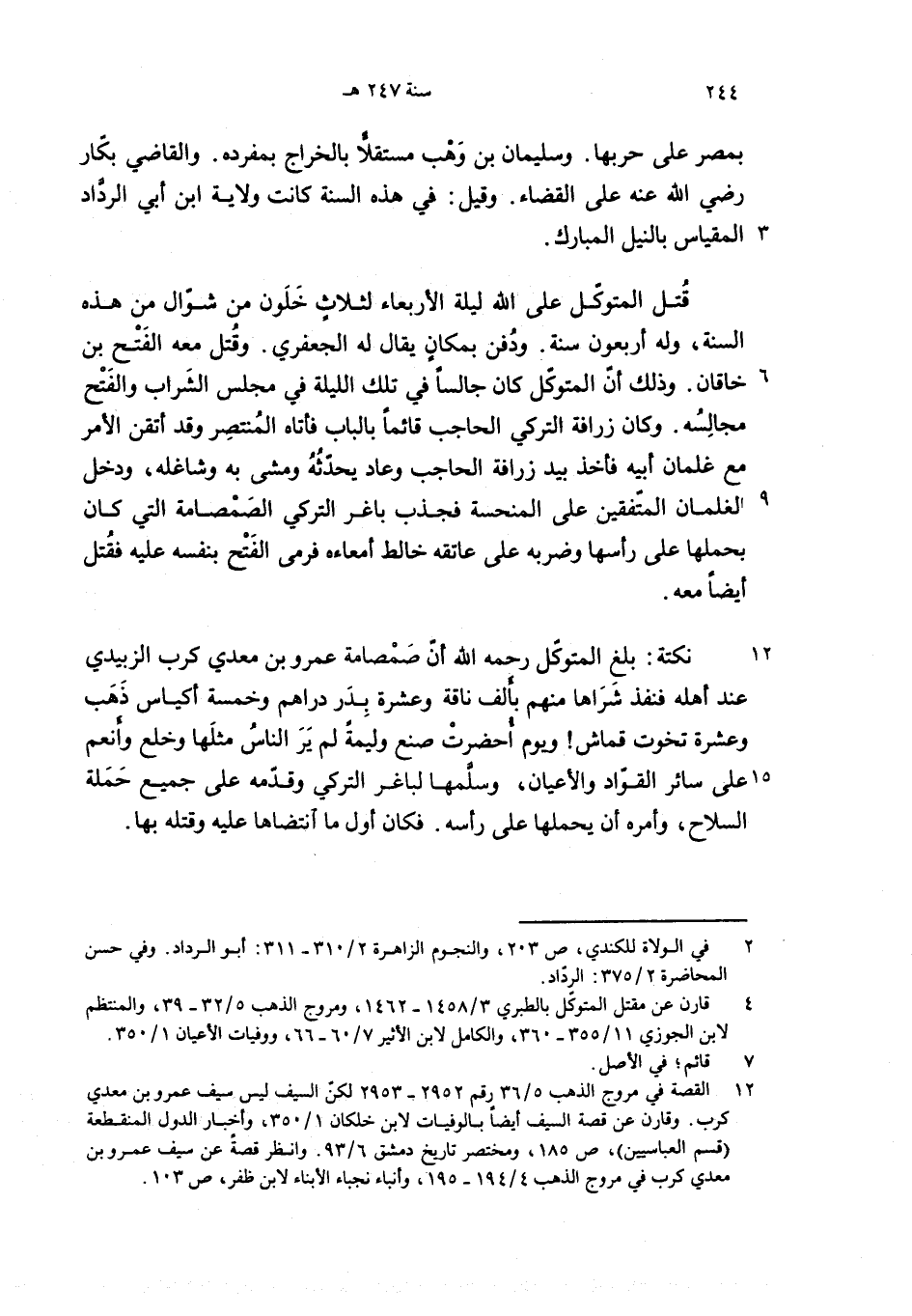 قتل المتوكّل على الله ليلة الأربعاء لثلاث خلون من شوّال من هذه السنة، وله أربعون سنة. ودفن بمكان يقال له الجعفري. وقتل معه الفتح بن خاقان. وذلك أنّ المتوكّل كان جالسا في تلك الليلة في مجلس الشراب والفتح مجالسه. وكان زرافة التركي الحاجب قائما بالباب فأتاه المنتصر وقد أتقن الأمر مع غلمان أبيه فأخذ بيد زرافة الحاجب وعاد يحدّثه ومشى به وشاغله، ودخل لغلمان المتّفقين على المنحسة فجذب باغر التركي الصمصامة التي كان بحملها على رأسها وضربه على عاتقه خالط أمعاءه فرمى الفتح بنفسه عليه فقتل أيضا معه.