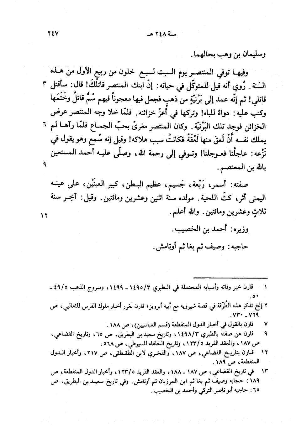 وفيها توفي المنتصر يوم السبت لسبع خلون من ربيع الأول من هذه السنة. روي أنه قيل للمتوكّل في حياته: إنّ ابنك المنتصر قاتلك! قال: سأقتل قاتلي! ثم إنّه عمد إلى برنيّة من ذهب فجعل فيها معجونا فيهم سمّ قاتل وختمها وكتب عليه: دواء للباه! وتركها في أعزّ خزائنه. فلمّا خلا وجه المنتصر عرض الخزائن فوجد تلك البرنيّة. وكان المنتصر مغرى بحبّ الجماع فلمّا رآها لم يملك نفسه أن لعق منها لعقة فكانت سبب هلاكه! وقيل إنه سمع وهو يقول في نزعه: عاجلنا فعوجلنا! وتوفي إلى رحمة الله، وصلّى عليه أحمد المستعين بالله بن المعتصم.