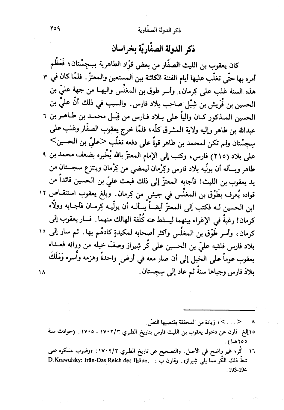كان يعقوب بن الليث الصفّار من بعض قوّاد الطاهرية بسجستان؛ فعظم أمره بها حتّى تغلّب عليها أيام الفتنة الكائنة بين المستعين والمعتزّ. فلمّا كان في هذه السنة غلب على كرمان، وأسر طوق بن المغلّس واليها من جهة عليّ بن الحسين بن قريش بن شبل صاحب بلاد فارس. والسبب في ذلك أنّ عليّ بن الحسين المذكور كان واليا على بلاد فارس من قبل محمد بن طاهر بن عبد الله بن طاهر وإليه ولاية المشرق كلّه؛ فلمّا خرج يعقوب الصفّار وغلب على سجستان ولم تكن لمحمد بن طاهر قوة على دفعه تغلّب <عليّ بن الحسين> على بلاد (215) فارس، وكتب إلى الإمام المعتزّ بالله يخبره بضعف محمد بن طاهر ويسأله أن يولّيه بلاد فارس وكرمان ليمضي من كرمان وينتزع سجستان من يد يعقوب بن الليث! فأجابه المعتزّ إلى ذلك فبعث عليّ بن الحسين قائدا من قواده يعرف بطوق بن المغلّس في جيش من كرمان. وبلغ يعقوب استنقاص ابن الحسين له فكتب إلى المعتزّ أيضا يسأله أن يولّيه كرمان فأجابه وولاّه كرمان! رغبة في الإغراء بينهما ليسقط عنه كلفة الهالك منهما. فسار يعقوب إلى كرمان، وأسر طوق بن المغلّس وأكثر أصحابه لمكيدة كادهم بها. ثم سار إلى بلاد فارس فلقيه عليّ بن الحسين على كر شيراز وصفّ خيله من ورائه فعداه يعقوب عوما على الخيل إلى أن صار معه في أرض واحدة وهزمه وأسره وملك بلاد فارس وجباها سنة ثم عاد إلى سجستان.
