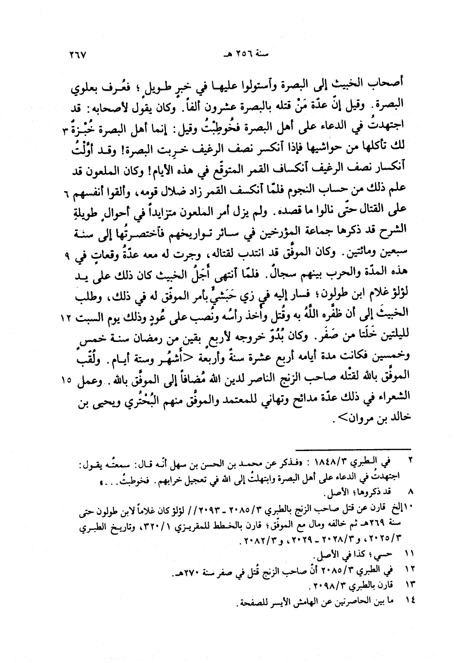 أصحاب الخبيث إلى البصرة واستولوا عليها في خبر طويل؛ فعرف بعلوي البصرة. وقيل إنّ عدّة من قتله بالبصرة عشرون ألفا. وكان يقول لأصحابه: قد اجتهدت في الدعاء على أهل البصرة فخوطبت وقيل: إنما أهل البصرة خبزة لك تأكلها من حواشيها فإذا انكسر نصف الرغيف خربت البصرة! وقد أوّلت انكسار نصف الرغيف انكساف القمر المتوقّع في هذه الأيام! وكان الملعون قد علم ذلك من حساب النجوم فلمّا انكسف القمر زاد ضلال قومه، وألقوا أنفسهم على القتال حتّى نالوا ما قصده. ولم يزل أمر الملعون متزايدا في أحوال طويلة الشرح قد ذكرها جماعة المؤرخين في سائر تواريخهم فاختصرتها إلى سنة سبعين ومائتين. وكان الموفّق قد انتدب لقتاله، وجرت له معه عدّة وقعات في هذه المدّة والحرب بينهم سجال. فلمّا انتهى أجل الخبيث كان ذلك على يد لؤلؤ غلام ابن طولون؛ فسار إليه في زي حبشيّ بأمر الموفّق له في ذلك، وطلب الخبيث إلى أن ظفّره الله به وقتل وأخذ رأسه ونصب على عود وذلك يوم السبت لليلتين خلتا من صفر. وكان بدوّ خروجه لأربع بقين من رمضان سنة خمس وخمسين فكانت مدة أيامه أربع عشرة سنة وأربعة <أشهر وستة أيام. ولقّب الموفّق بالله لقتله صاحب الزنج الناصر لدين الله مضافا إلى الموفّق بالله. وعمل الشعراء في ذلك عدّة مدائح وتهاني للمعتمد والموفّق منهم البحتري ويحيى بن خالد بن مروان>.