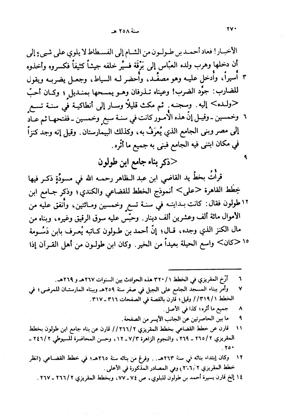 قرأت بخط يد القاضي ابن عبد الظاهر رحمه الله في مسودّة ذكر فيها خطط القاهرة <على> أنموذج الخطط للقضاعي والكندي؛ وذكر جامع ابن طولون فقال: كانت بدايته في سنة تسع وخمسين ومائتين، وأنفق عليه من الأموال مائة ألف وعشرين ألف دينار. وحبّس عليه سوق الرقيق وغيره، وبناه من مال الكنز الذي وجده، قال؛ إنّ أحمد بن طولون كاتبه يعرف بابن دسومة <كان> واسع الحيلة بعيدا من الخير. وكان ابن طولون من أهل القرآن إذا