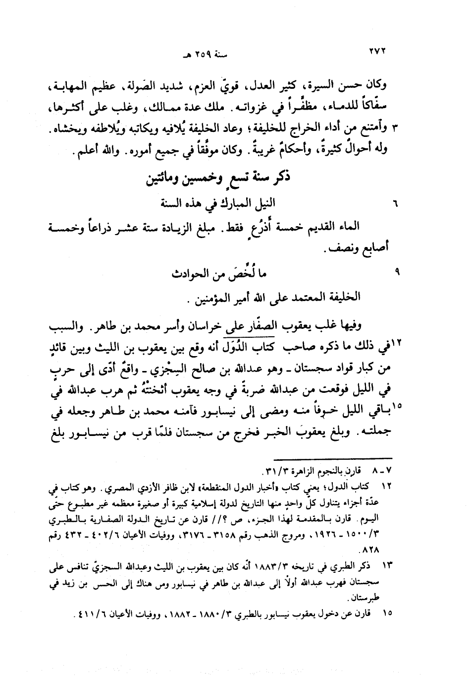 وفيها غلب يعقوب الصفّار على خراسان وأسر محمد بن طاهر. والسبب في ذلك ما ذكره صاحب كتاب الدول أنه وقع بين يعقوب بن الليث وبين قائد من كبار قواد سجستان-وهو عبد الله بن صالح السجزي-واقع أدّى إلى حرب في الليل فوقعت من عبد الله ضربة في وجه يعقوب أثخنته ثم هرب عبد الله في باقي الليل خوفا منه ومضى إلى نيسابور فآمنه محمد بن طاهر وجعله في جملته. وبلغ يعقوب الخبر فخرج من سجستان فلمّا قرب من نيسابور بلغ