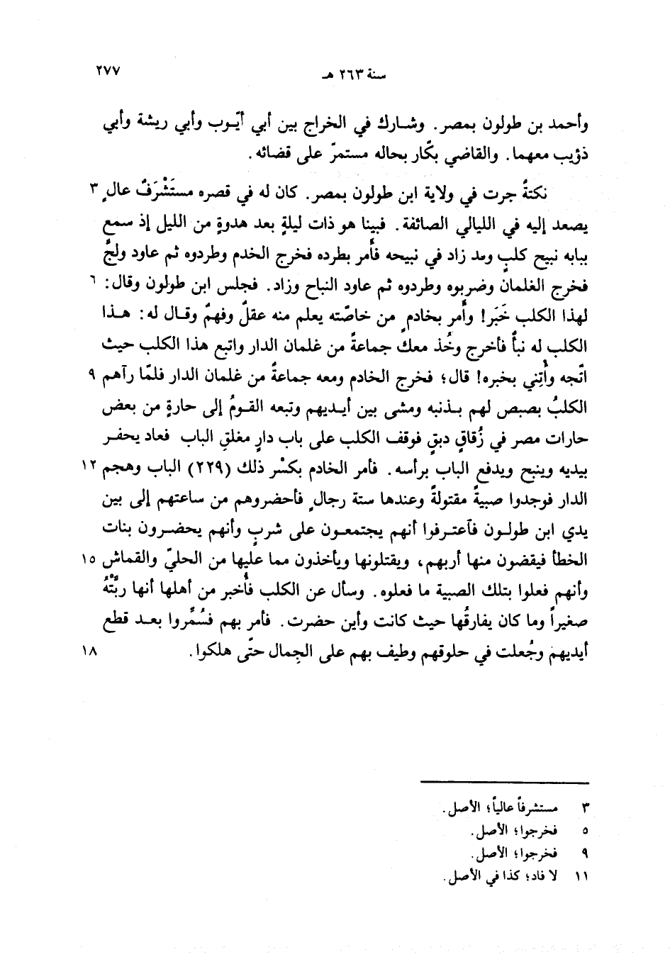 لهذا الكلب خبر! وأمر بخادم من خاصّته يعلم منه عقل وفهم وقال له: هذا الكلب له نبأ فأخرج وخذ معك جماعة من غلمان الدار واتبع هذا الكلب حيث اتّجه وأتني بخبره! قال؛ فخرج الخادم ومعه جماعة من غلمان الدار فلمّا رآهم الكلب بصبص لهم بذنبه ومشى بين أيديهم وتبعه القوم إلى حارة من بعض حارات مصر في زقاق دبق فوقف الكلب على باب دار مغلق الباب فعاد يحفر بيديه وينبح ويدفع الباب برأسه. فأمر الخادم بكسر ذلك (229) الباب وهجم الدار فوجدوا صبية مقتولة وعندها ستة رجال فأحضروهم من ساعتهم إلى بين يدي ابن طولون فاعترفوا أنهم يجتمعون على شرب وأنهم يحضرون بنات الخطأ فيقضون منها أربهم، ويقتلونها ويأخذون مما عليها من الحليّ والقماش وأنهم فعلوا بتلك الصبية ما فعلوه. وسأل عن الكلب فأخبر من أهلها أنها ربّته صغيرا وما كان يفارقها حيث كانت وأين حضرت. فأمر بهم فسمّروا بعد قطع أيديهم وجعلت في حلوقهم وطيف بهم على الجمال حتّى هلكوا.