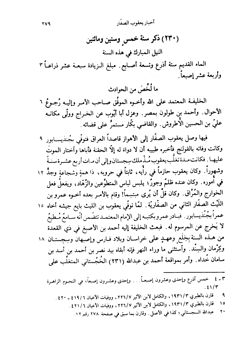 فيها وصل يعقوب الصفّار إلى الأهواز قاصدا العراق فتوفّي بجنديسابور وكانت وفاته بالقولنج فأخبره طبيبه أن لا دواء له إلاّ الحقنة فأباها واختار الموت عليها. فكانت مدة تغلّب يعقوب مذ ملك سجستان وإلى أن مات أربع عشرة سنة وشهورا. وكان يعقوب حازما في رأيه، ثابتا في حروبه، ذا همة وشجاعة وجدّ في أموره. وكان عنده ظلم وجور؛ يلبس لباس المتطوّعين والزهّاد، ويفعل فعل الخوارج والمرّاق. وكان قلّ أن يرى مبتسما! وقام بالأمر بعده أخوه عمرو بن الليث الصفّار الثاني من الصفّاريّة. لمّا توفّي يعقوب بن الليث بايع جيشه أخاه عمرا بجنديسابور. فبادر عمرو بكتبه إلى الإمام المعتمد تتضمّن أنّه سامع مطيع لا يخرج عن المرسوم له. فبعث الخليفة إليه أحمد بن الأصبغ في ذي القعدة من هذه السنة بخلع وعهد على خراسان وبلاد فارس وإصبهان وسجستان وكرمان والسند. واستثنى ما وراء النهر فإنه أبقاه بيد نصر بن أحمد بن أسد بن سامان خداه. وأمر بمواقعة أحمد بن عبد الله (231) الخجستاني المتغلّب على