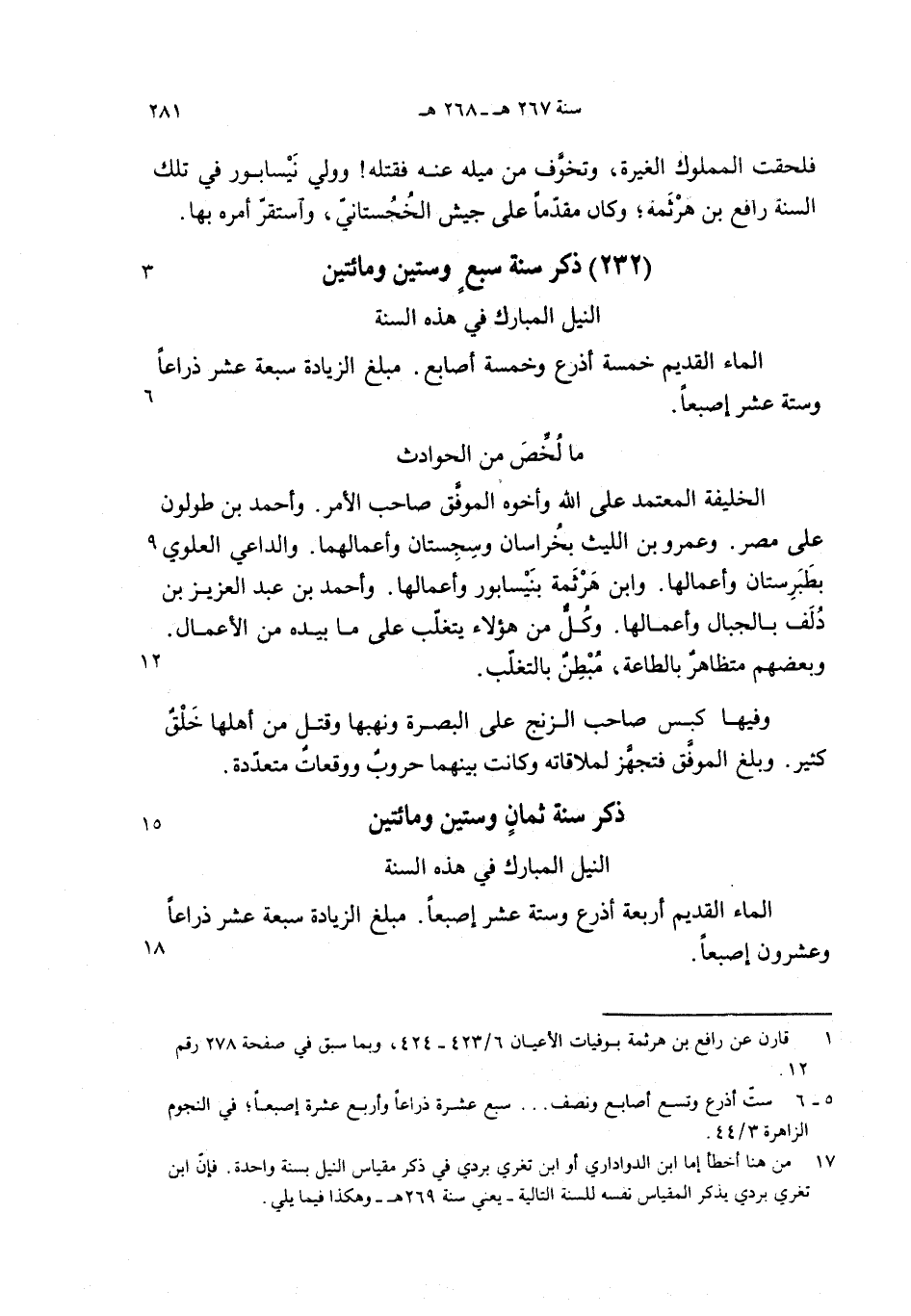 الماء القديم خمسة أذرع وخمسة أصابع. مبلغ الزيادة سبعة عشر ذراعا وستة عشر إصبعا.