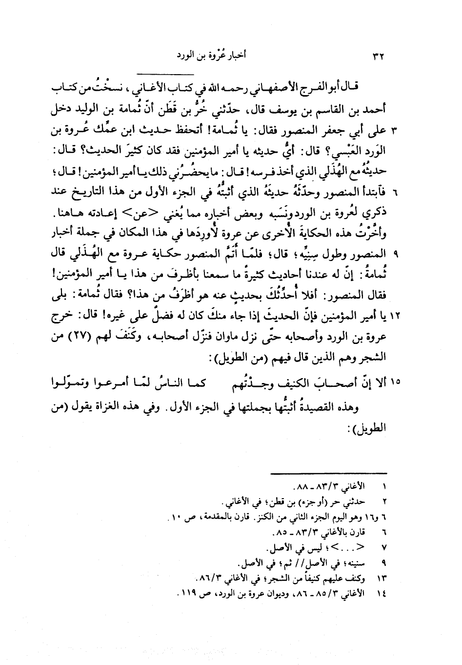 حديثه مع الهذلي الذي أخذ فرسه! قال: ما يحضرني ذلك يا أمير المؤمنين! قال؛ فابتدأ المنصور وحدّثه حديثه الذي أثبتّه في الجزء الأول من هذا التاريخ عند ذكري لعروة بن الورد ونسبه وبعض أخباره مما يغني <عن> إعادته هاهنا.