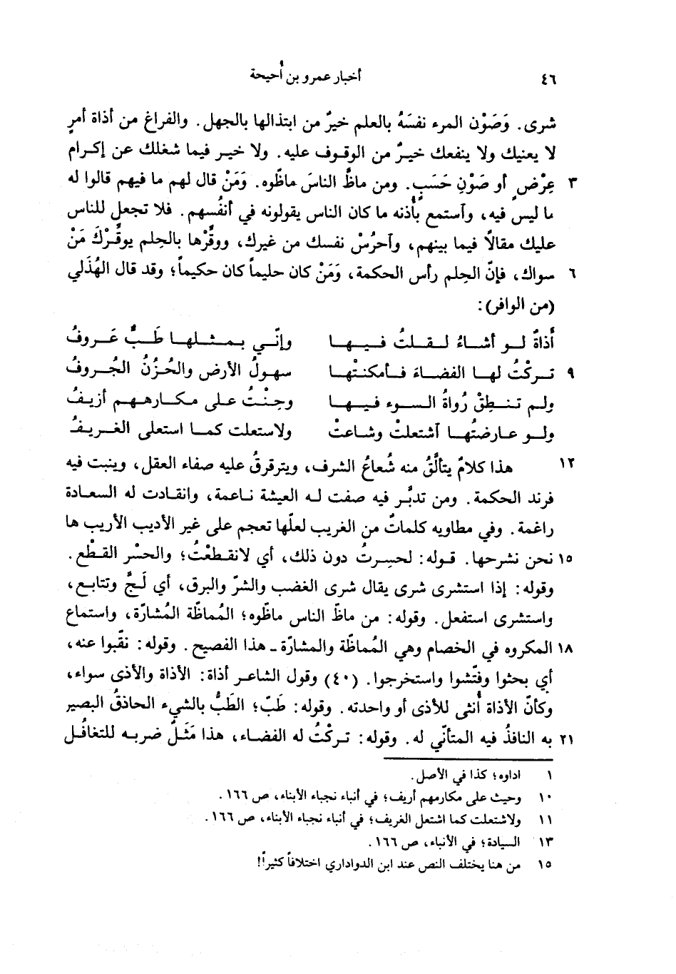 شرى. وصون المرء نفسه بالعلم خير من ابتذالها بالجهل. والفراغ من أذاة أمر لا يعنيك ولا ينفعك خير من الوقوف عليه. ولا خير فيما شغلك عن إكرام عرض أو صون حسب. ومن ماظّ الناس ماظّوه. ومن قال لهم ما فيهم قالوا له ما ليس فيه، واستمع بأذنه ما كان الناس يقولونه في أنفسهم. فلا تجعل للناس عليك مقالا فيما بينهم، واحرس نفسك من غيرك، ووقّرها بالحلم يوقّرك من سواك، فإنّ الحلم رأس الحكمة، ومن كان حليما كان حكيما؛ وقد قال الهذلي (من الوافر):