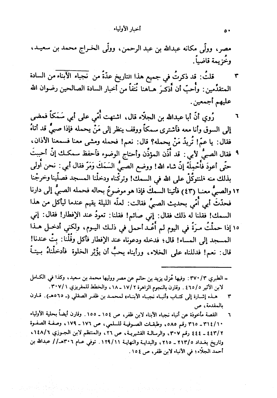 روي أنّ أبا عبد الله بن الجلاّء قال، اشتهت أمّي على أبي سمكا فمضى إلى السوق وأنا معه فاشترى سمكا ووقف ينظر إلى من يحمله فإذا صبيّ قد أتاه فقال: يا عمّ! تريد من يحمله؟ قال: نعم! فحمله ومشى معنا فسمعنا الأذان، فقال الصبيّ لأبي: قد أذّن المؤذّن وأحتاج الوضوء فاحفظ سمكك إن أحببت حتّى أعود فأحمله إنّ شاء الله! ووضع الصبيّ السمك ومرّ فقال أبي: نحن أولى بذلك منه فلنتوكّل على الله في السمك! وتركناه ودخلنا المسجد فصلّينا وخرجنا والصبيّ معنا (43) فأتينا السمك فإذا هو موضوع بحاله فحمله الصبيّ إلى دارنا فحدّث أبي أمّي بحديث الصبيّ فقالت: لعلّه الليلة يقيم عندما ليأكل من هذا السمك! فقلنا له ذلك فقال: إني صائم! فقلنا: تعود عند الإفطار! فقال: إني إذا حملت مرة في اليوم لم أعد أحمل في ذلك اليوم، ولكني أدخل هذا المسجد إلى المساء! قال؛ فدخله ودعوناه عند الإفطار فأكل وقلنا: بت عندنا! قال: نعم! فدللناه على الخلاء، ورأيناه يحبّ أن يؤثر الخلوة فأدخلناه بيتا