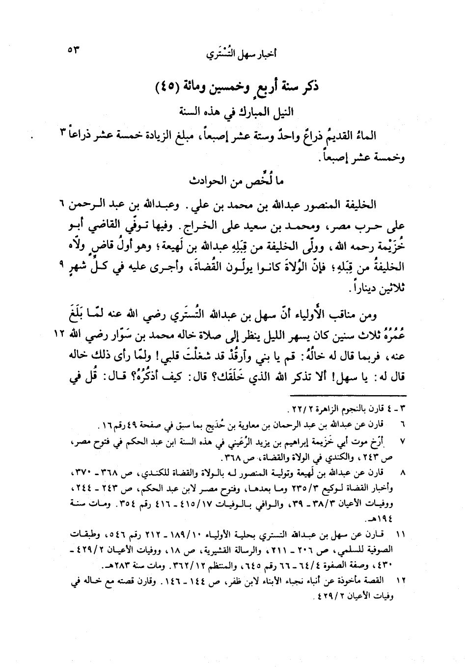 الخليفة المنصور عبد الله بن محمد بن علي. وعبد الله بن عبد الرحمن على حرب مصر، ومحمد بن سعيد على الخراج. وفيها توفّي القاضي أبو خزيمة رحمه الله، وولّى الخليفة من قبله عبد الله بن لهيعة؛ وهو أول قاض ولاّه الخليفة من قبله؛ فإنّ الولاة كانوا يولّون القضاة، وأجرى عليه في كلّ شهر ثلاثين دينارا.