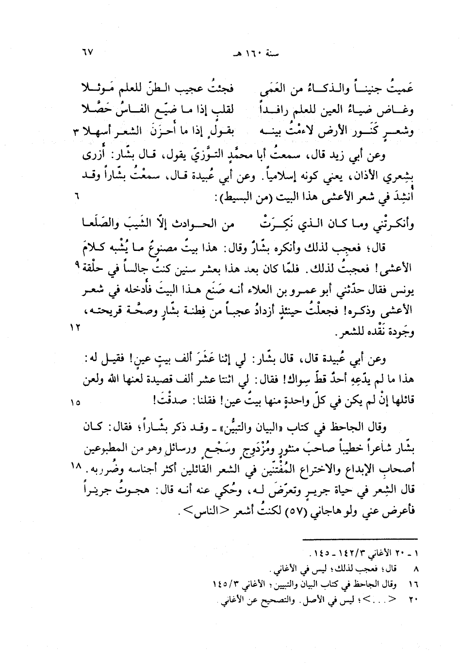 قال؛ فعجب لذلك وأنكره بشّار وقال: هذا بيت مصنوع ما يشبه كلام الأعشى! فعجبت لذلك. فلمّا كان بعد هذا بعشر سنين كنت جالسا في حلقة يونس فقال حدّثني أبو عمرو بن العلاء أنه صنع هذا البيت فأدخله في شعر الأعشى وذكره! فجعلت حينئذ أزداد عجبا من فطنة بشّار وصحّة قريحته، وجودة نقده للشعر.