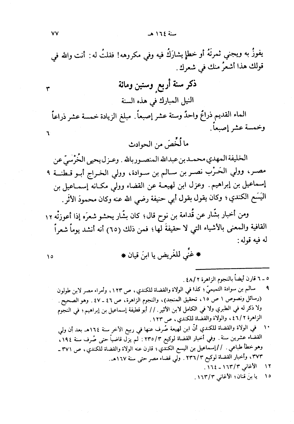 الخليفة المهدي محمد بن عبد الله المنصور بالله. وعزل يحيى الخرسيّ عن مصر، وولي الحرب نصر بن سالم بن سوادة، وولي الخراج أبو قطنة إسماعيل بن إبراهيم. وعزل ابن لهيعة عن القضاء وولي مكانه إسماعيل بن اليسع الكندي؛ وكان يقول بقول أبي حنيفة رضي الله عنه وكان محمود الأثر.