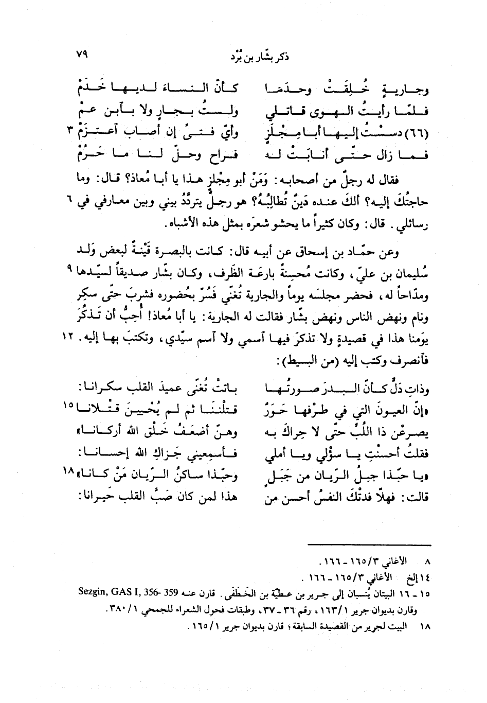 وعن حمّاد بن إسحاق عن أبيه قال: كانت بالبصرة قينة لبعض ولد سليمان بن عليّ، وكانت محسنة بارعة الظرف، وكان بشّار صديقا لسيّدها ومدّاحا له، فحضر مجلسه يوما والجارية تغنّي فسرّ بحضوره فشرب حتّى سكر ونام ونهض الناس ونهض بشّار فقالت له الجارية: يا أبا معاذ! أحبّ أن تذكر يومنا هذا في قصيدة ولا تذكر فيها اسمي ولا اسم سيّدي، وتكتب بها إليه.