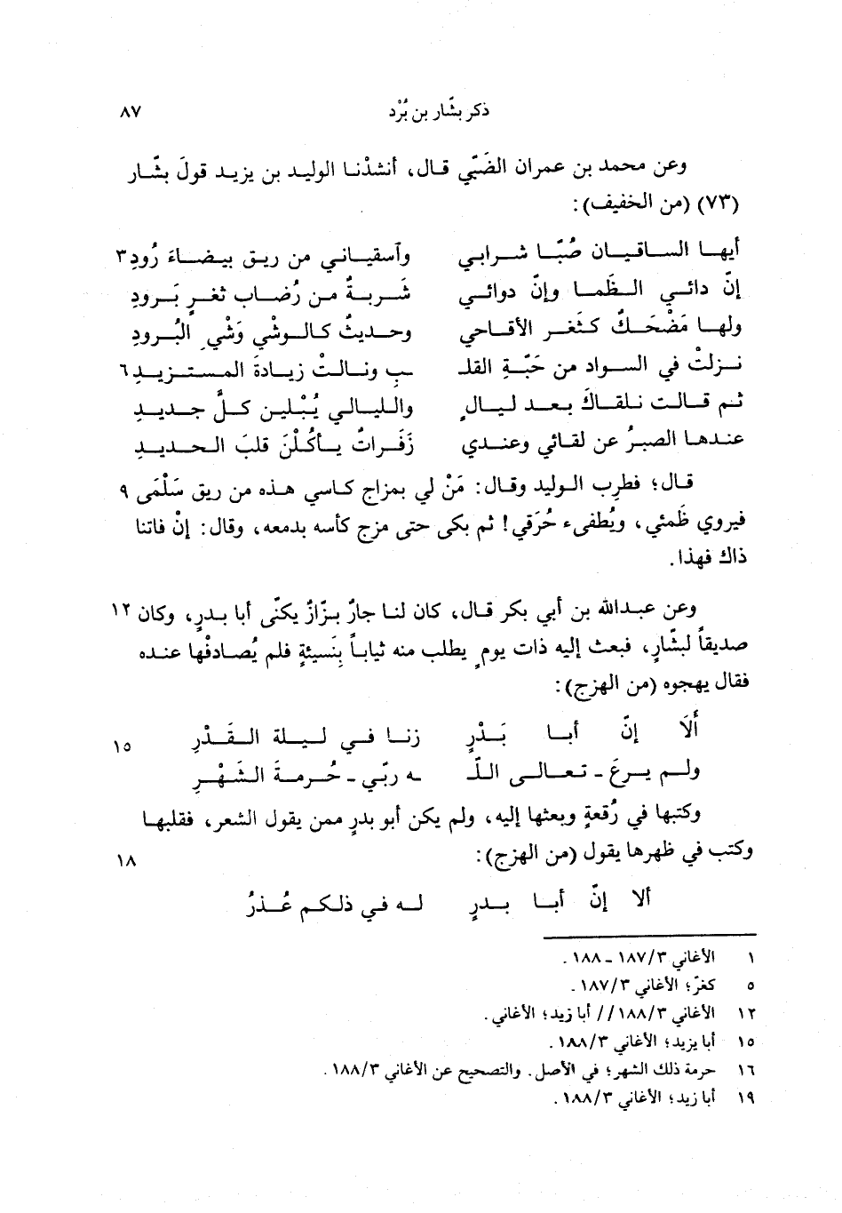وعن محمد بن عمران الضبّي قال، أنشدنا الوليد بن يزيد قول بشّار (73) (من الخفيف):