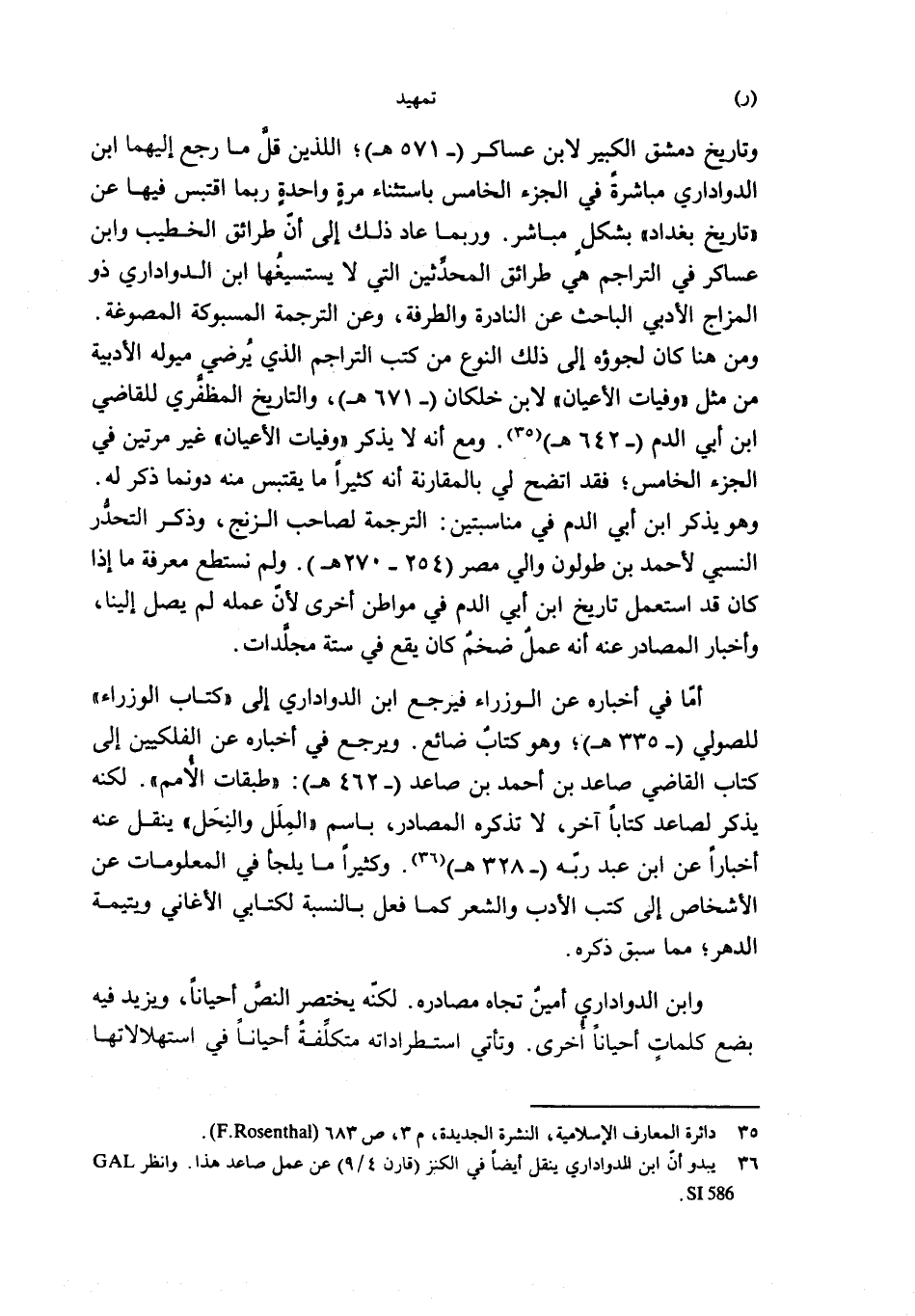ومن هنا كان لجوؤه إلى ذلك النوع من كتب التراجم الذي يرضي ميوله الأدبية من مثل «وفيات الأعيان» لابن خلكان (-671 هـ‍)،والتاريخ المظفّري للقاضي ابن أبي الدم (-642 هـ‍).ومع أنه لا يذكر «وفيات الأعيان» غير مرتين في الجزء الخامس؛ فقد اتضح لي بالمقارنة أنه كثيرا ما يقتبس منه دونما ذكر له.